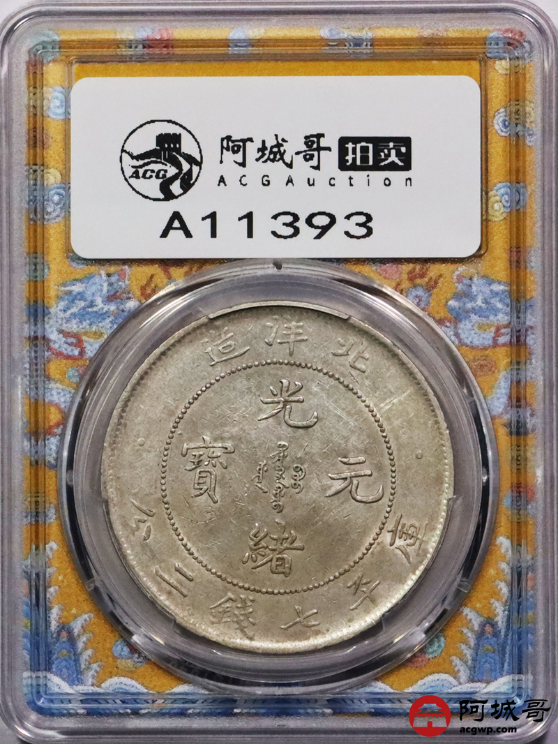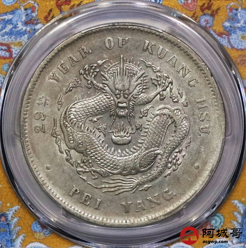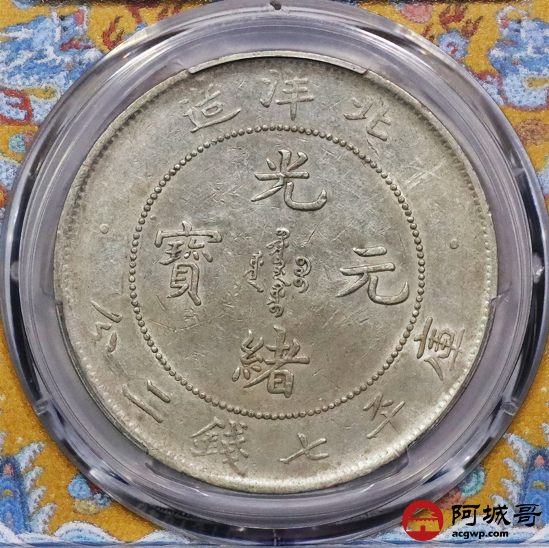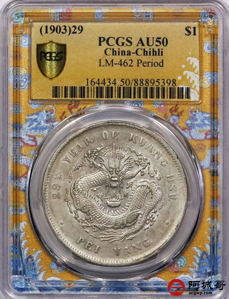 Lot:3288 1903光绪二十九年北洋造光绪元宝库平七钱二分银币一枚,G后点,龙鳞饱满,黄油底板 PCGS AU50 评级编号:88895398