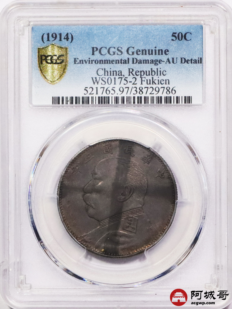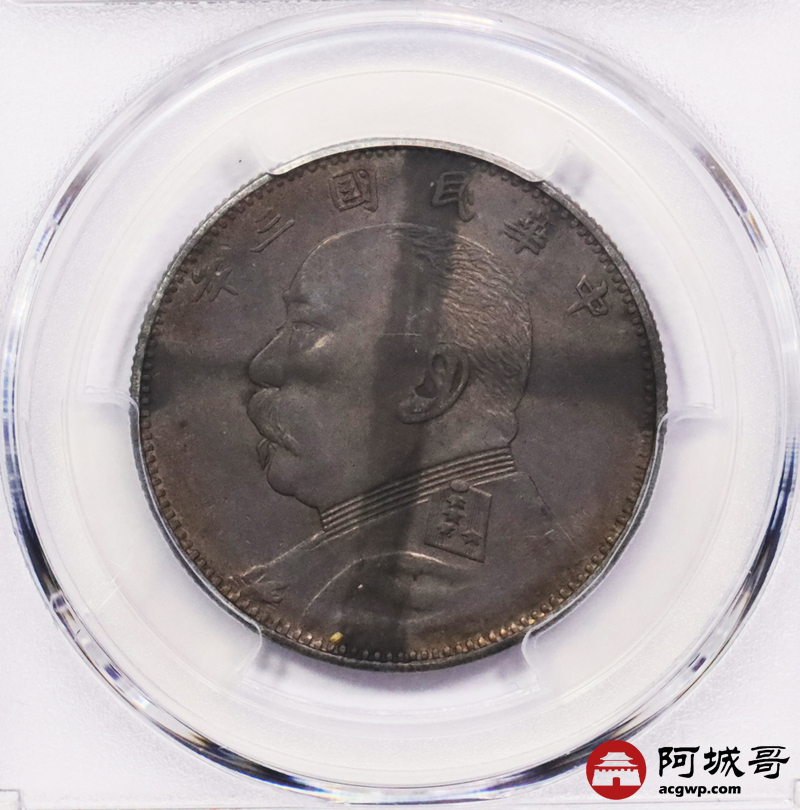 Lot:3511 1914民国三年袁世凯像中圆银币一枚,“福建版”酱彩老包浆PCGS AU评级编号:38729786