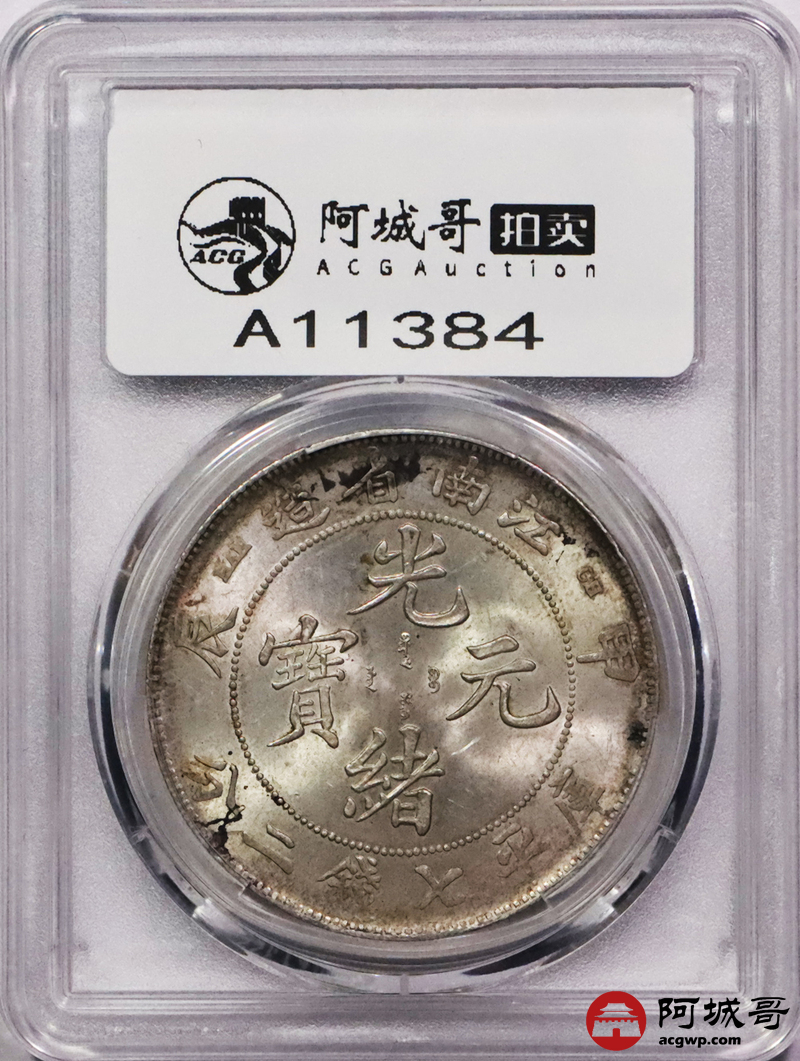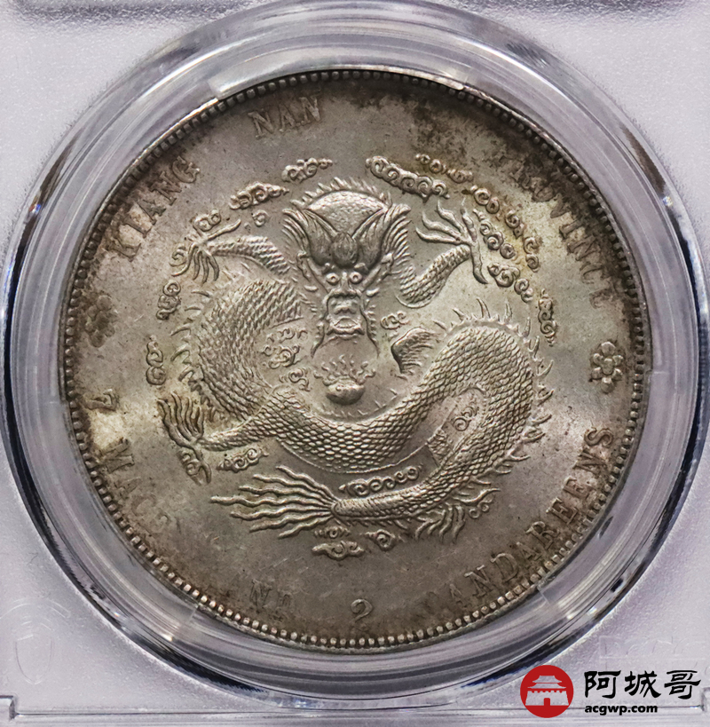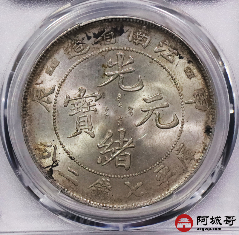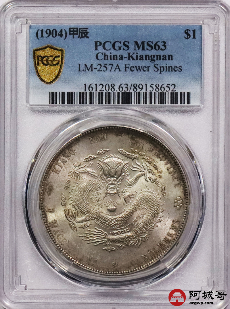 Lot:3375 1904甲辰年江南省造光绪元宝库平七钱二分银币一枚,原光深打满龙鳞PCGS MS63评级编号:89158652