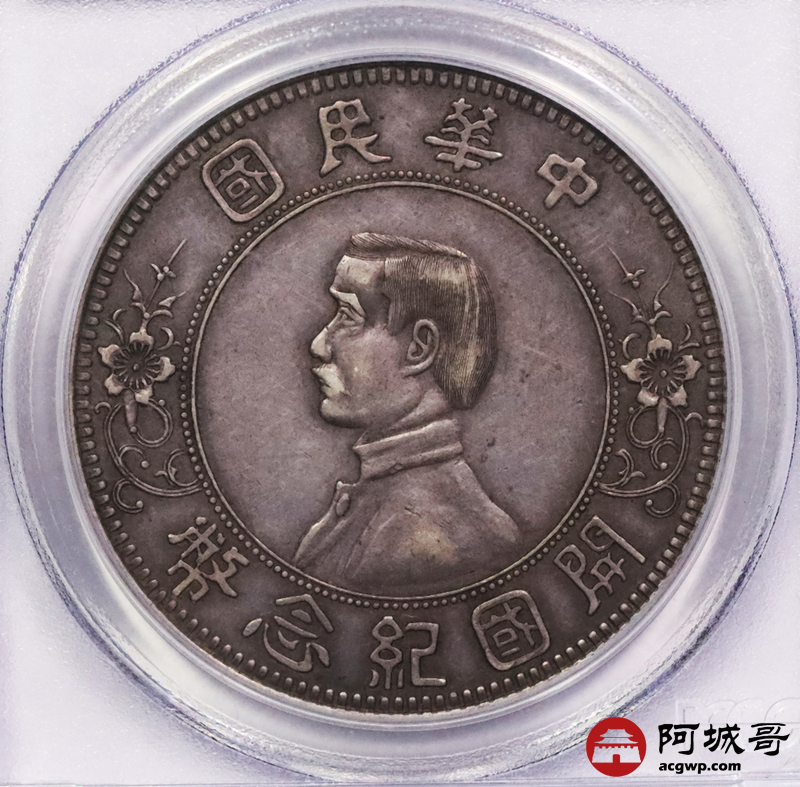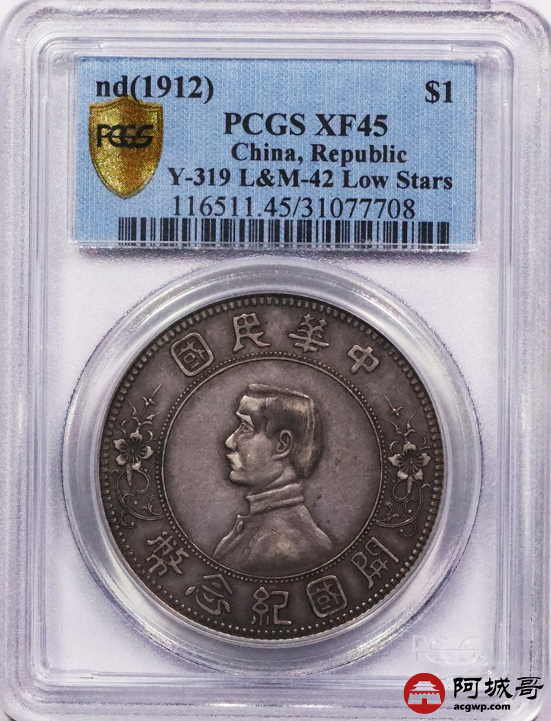 Lot:3104 1912孙中山像开国纪念壹圆银币一枚,“下五星”入骨酱彩 传世老包浆PCGS XF45评级编号:31077708