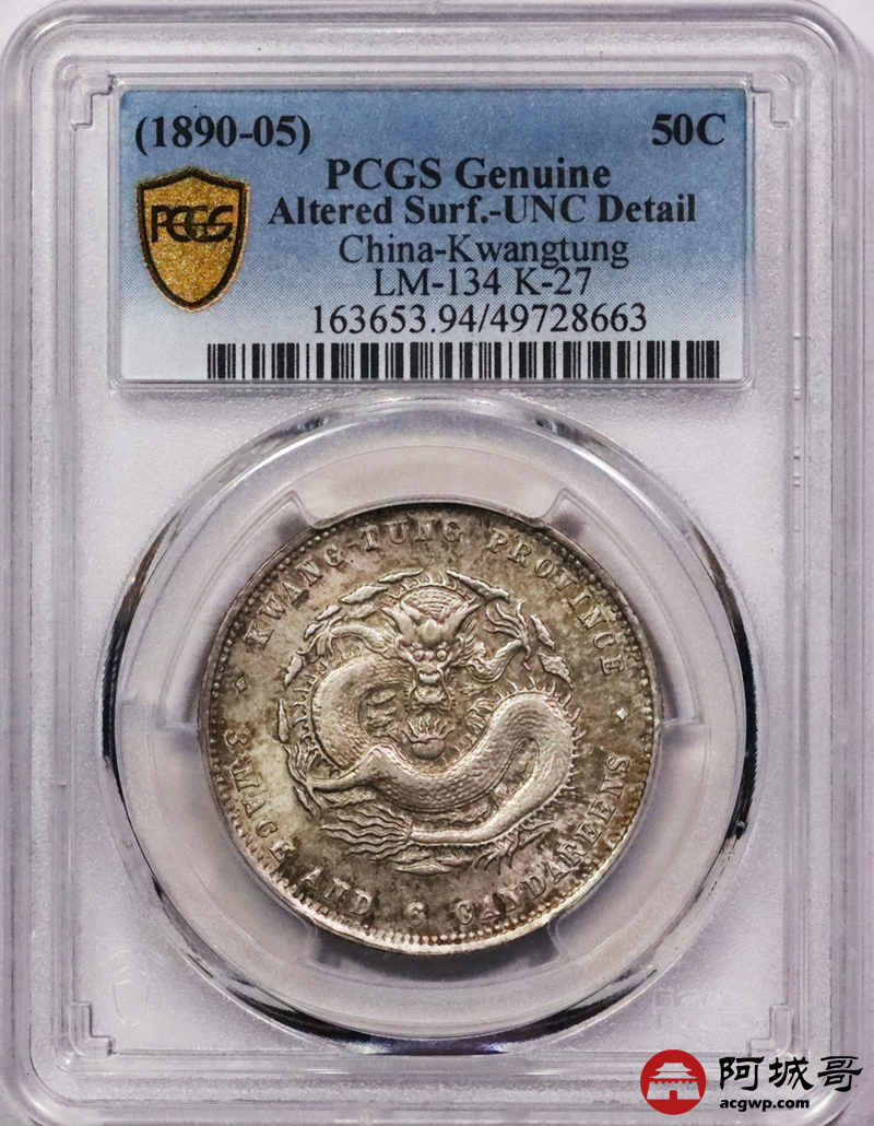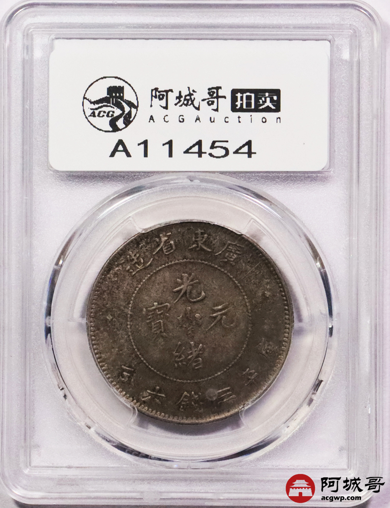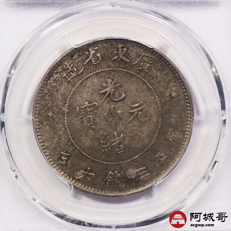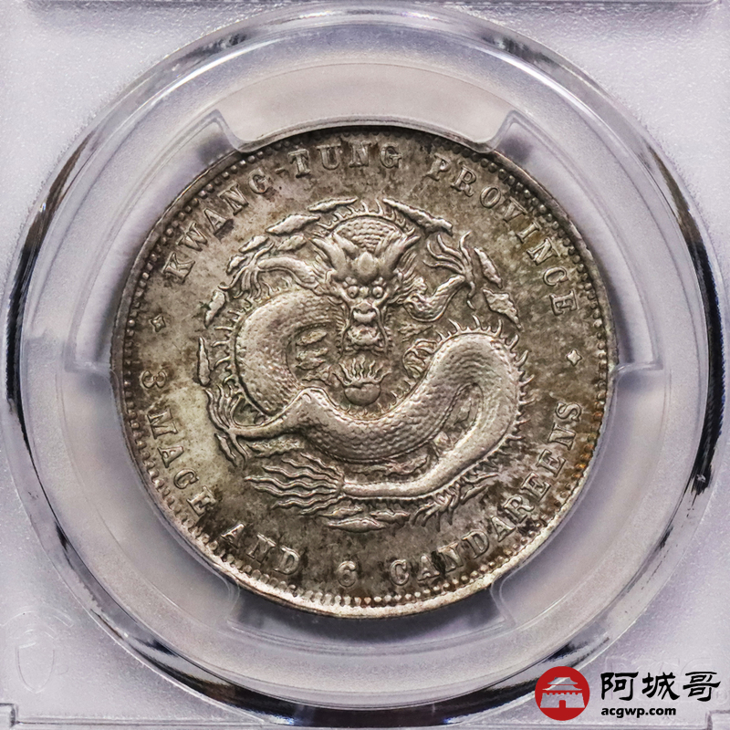 Lot:3386 1890-05广东省造光绪元宝库平三钱六分银币一枚,镜面原光,五彩底板 PCGS UNC 评级编号:49728663