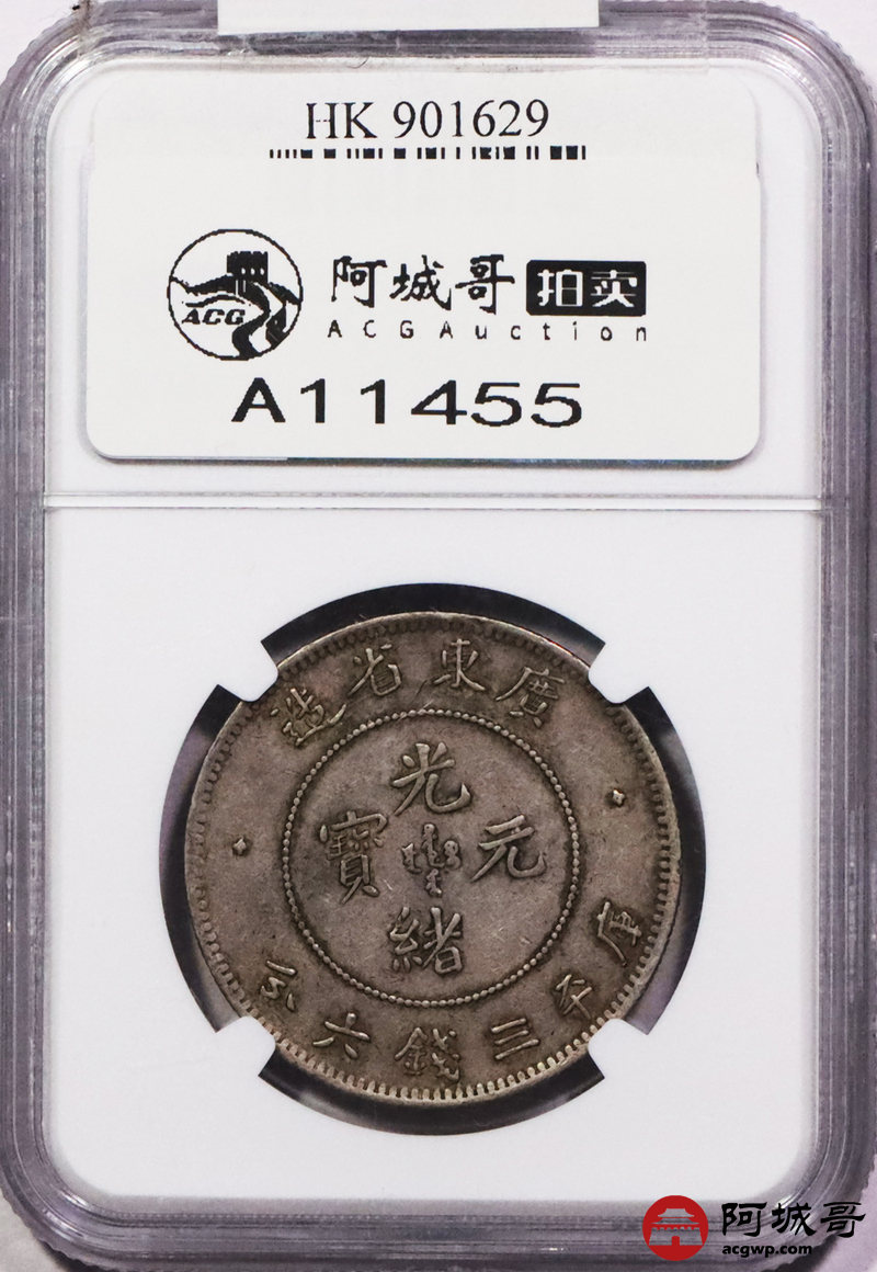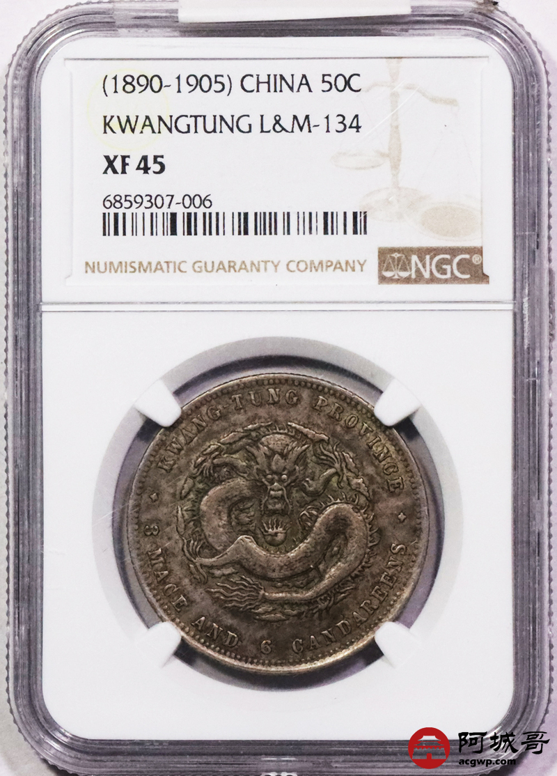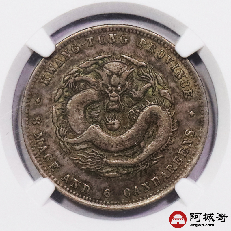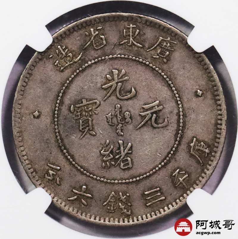 Lot:3387 1890-05广东省造光绪元宝库平三钱六分银币一枚,原味老包浆 NGC XF45 评级编号:6859307-006