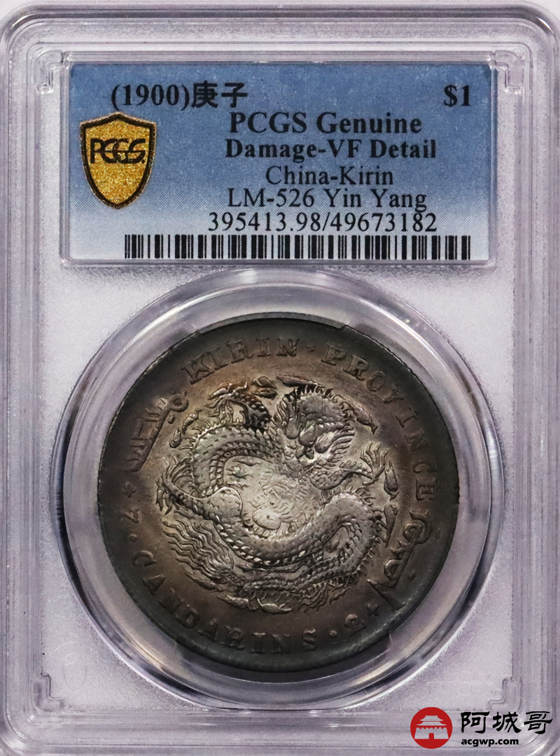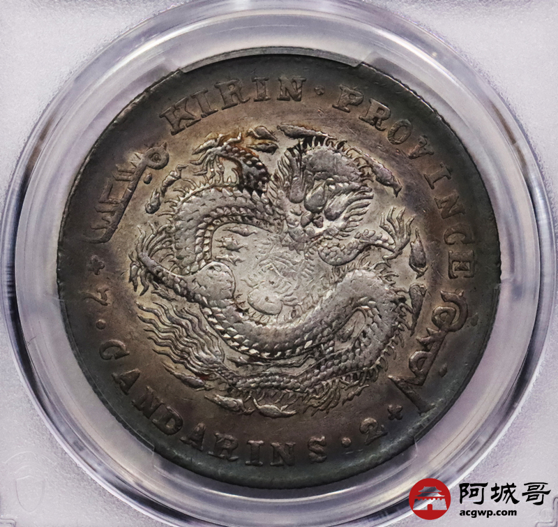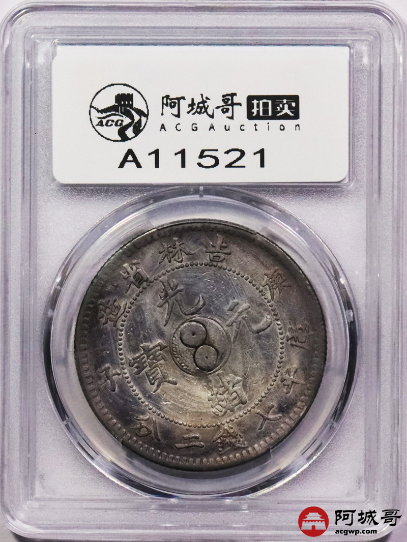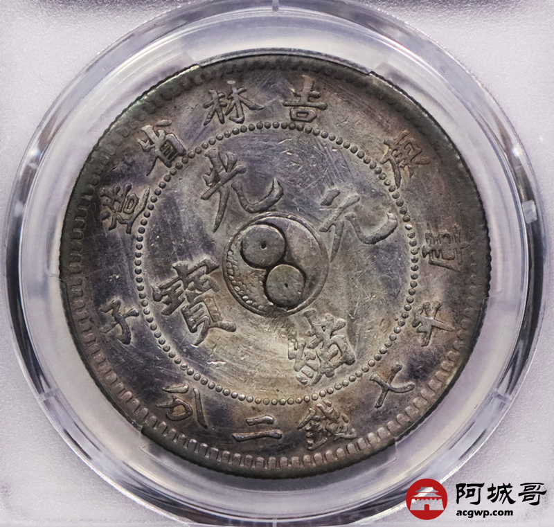 Lot:3396 1900庚子年吉林省造光绪元宝库平七钱二分银币一枚,紫罗兰环五彩包浆 PCGS VF