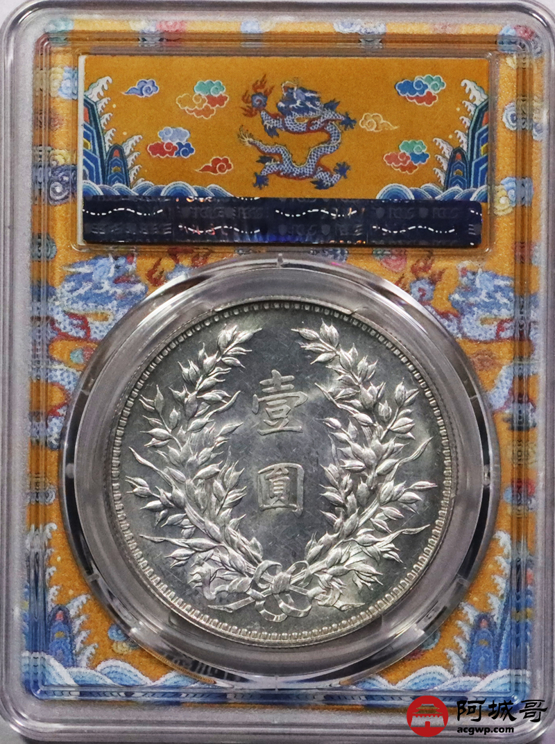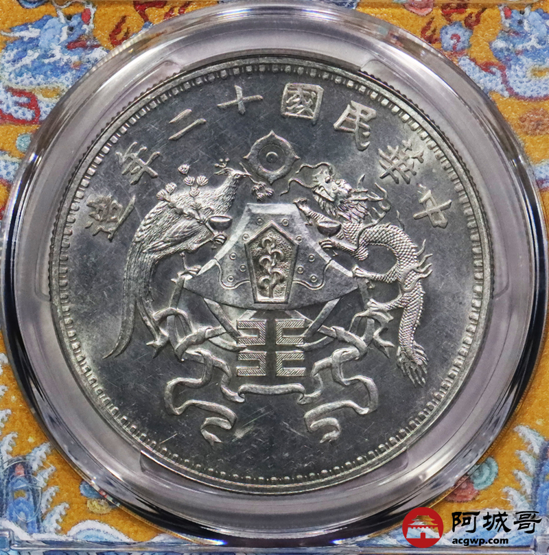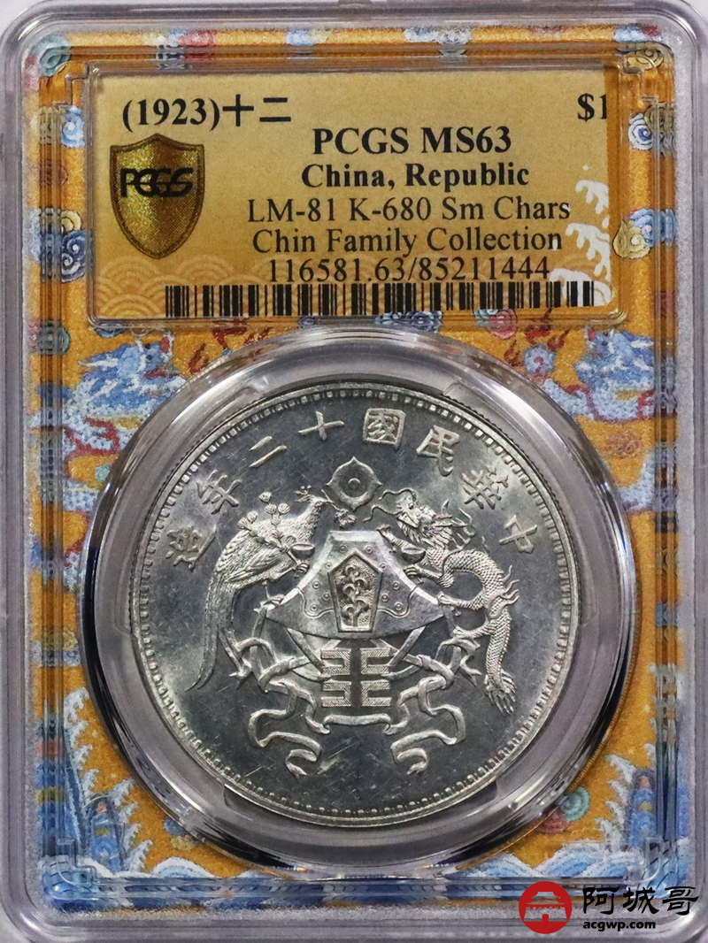 Lot:3167 1923民国十二年造龙凤壹圆银币一枚,小字版,打模犀利,铸工极尽精美,图案文字挺拔立体,龙头凤羽等细呈现的淋漓尽致,底板细腻平滑,银光四溢,状态难得 PCGS MS63