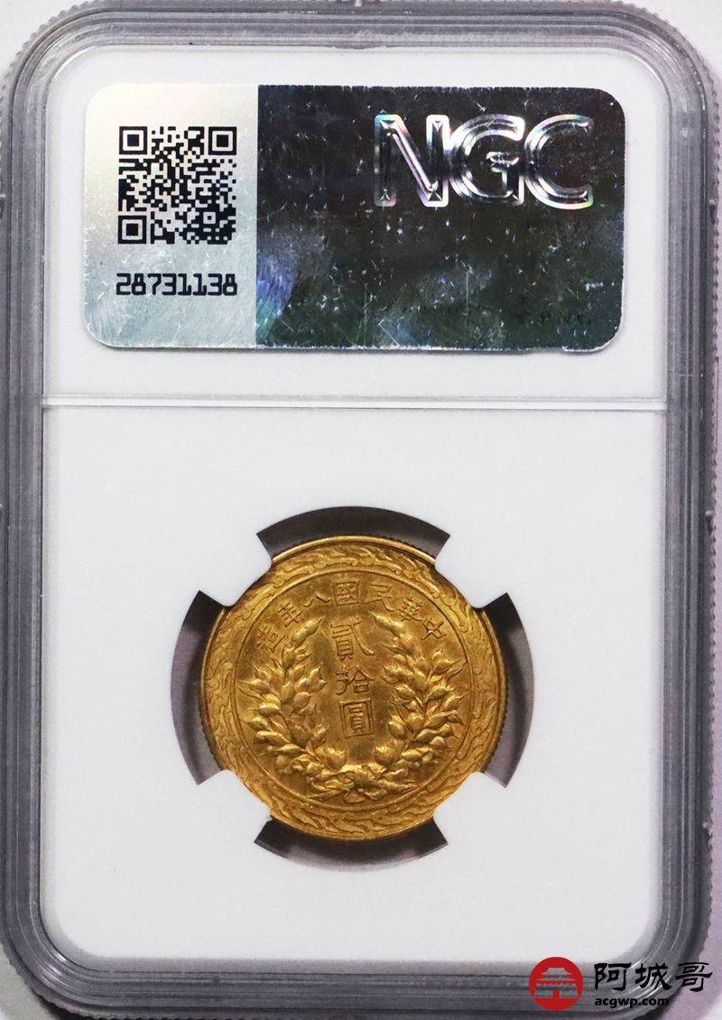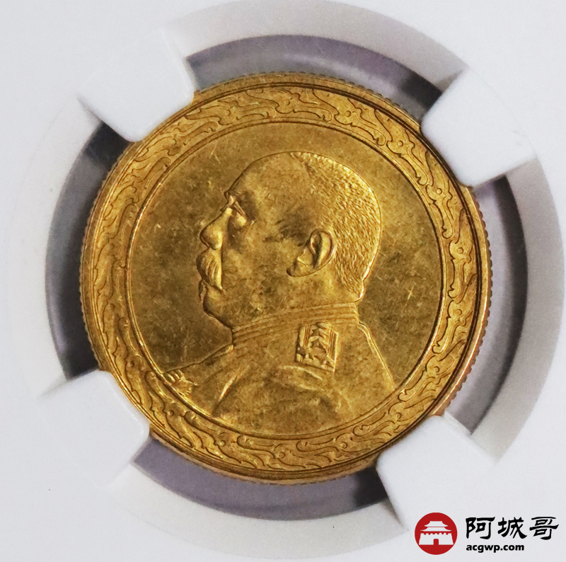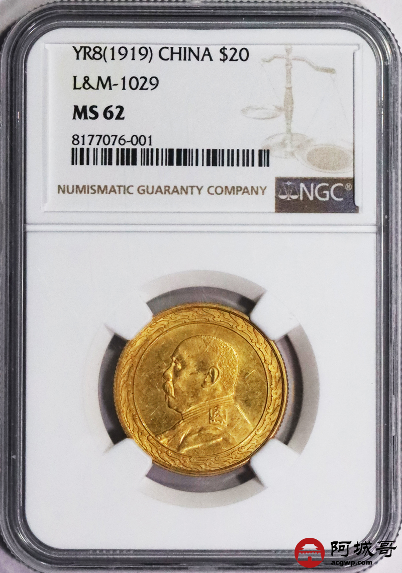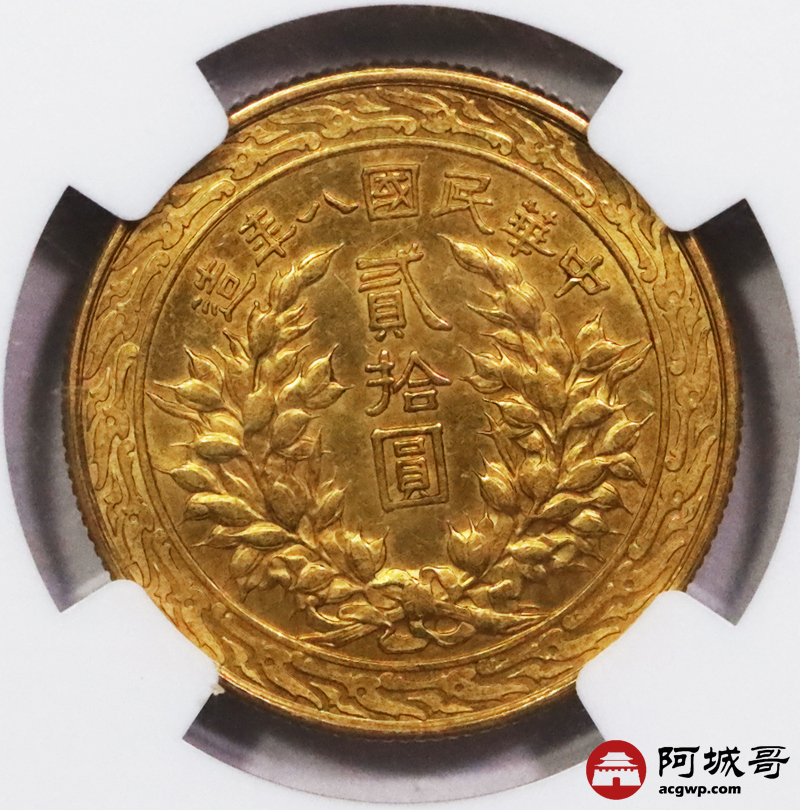 Lot:3221 1919民国八年袁世凯像嘉禾贰拾圆金币一枚,钢模初打,压力十足,图案极尽精美,人像须发纤毫毕现,天津造币总厂铸造,原拟正式发行,终未流通,铸额无多 NGC MS62