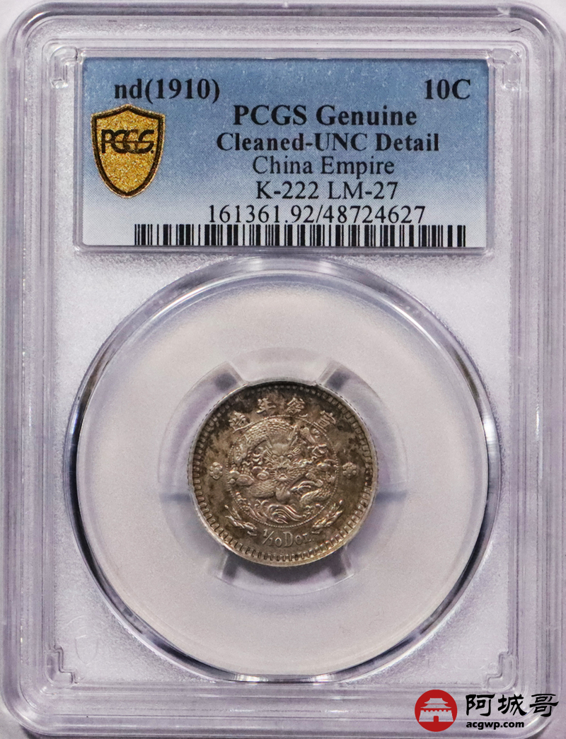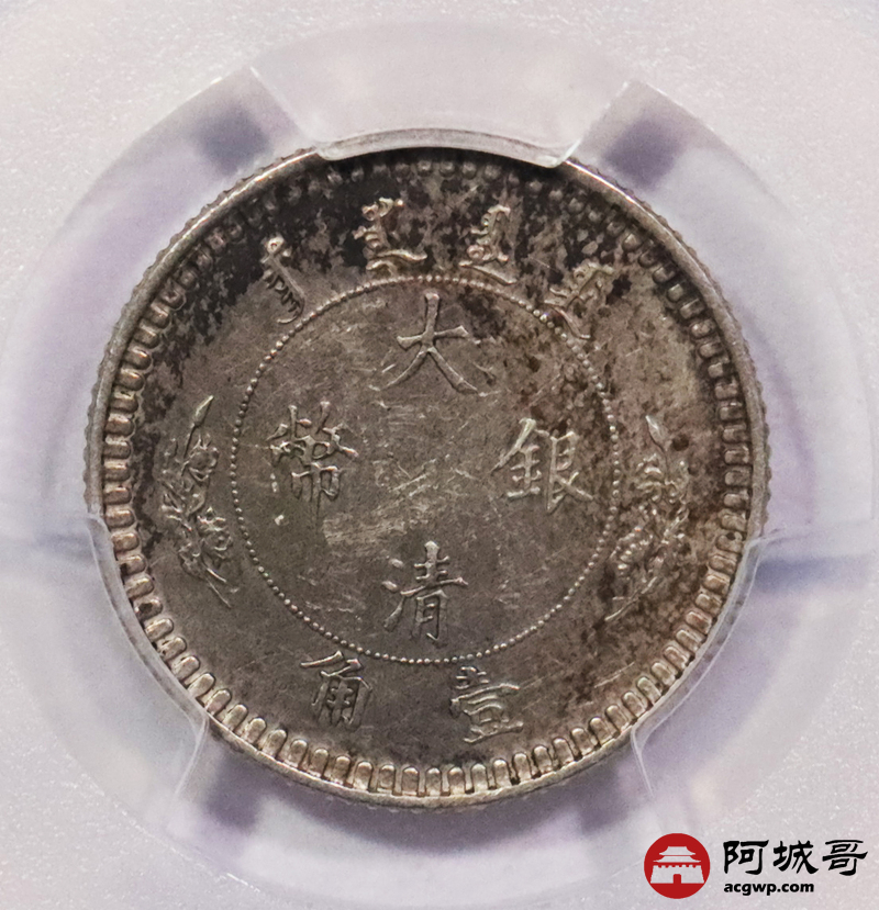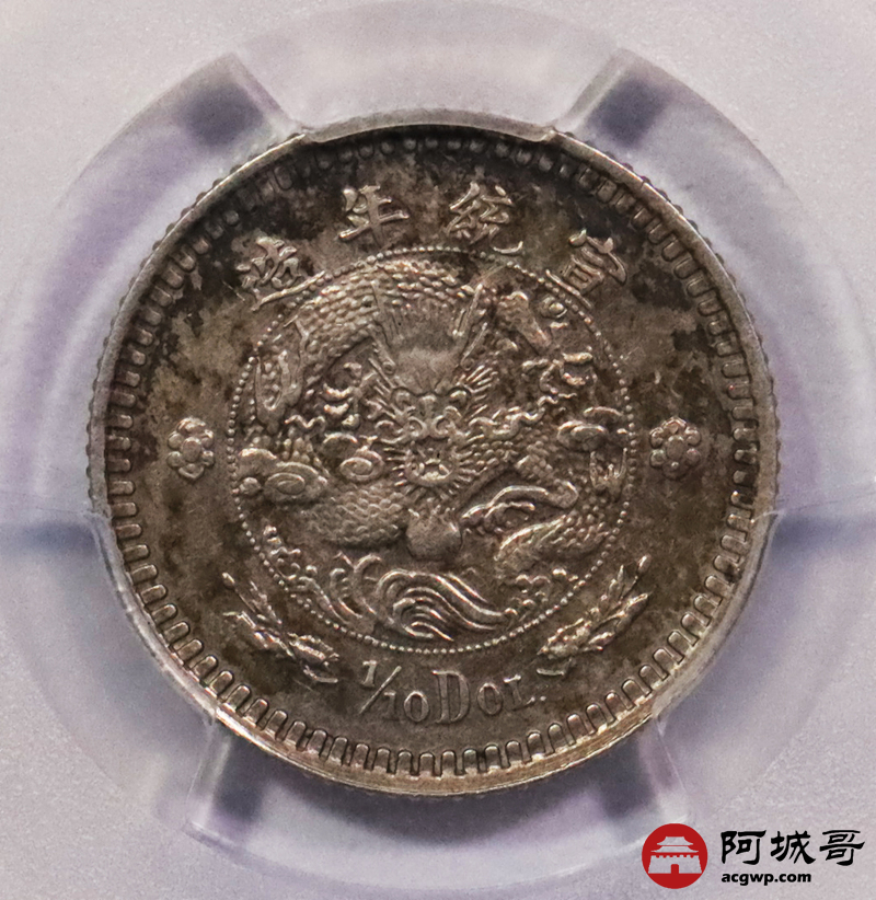 Lot:3070 1910宣统二年大清水龙壹角银币一枚,水龙系列银币由奥地利维也纳造币厂设计制模,铸造工艺极为卓越,字口挺拔犀利,花枝灵动,龙身高高跃出币面,细节淋漓尽致,五彩底板,状态极佳 PCGS UNC