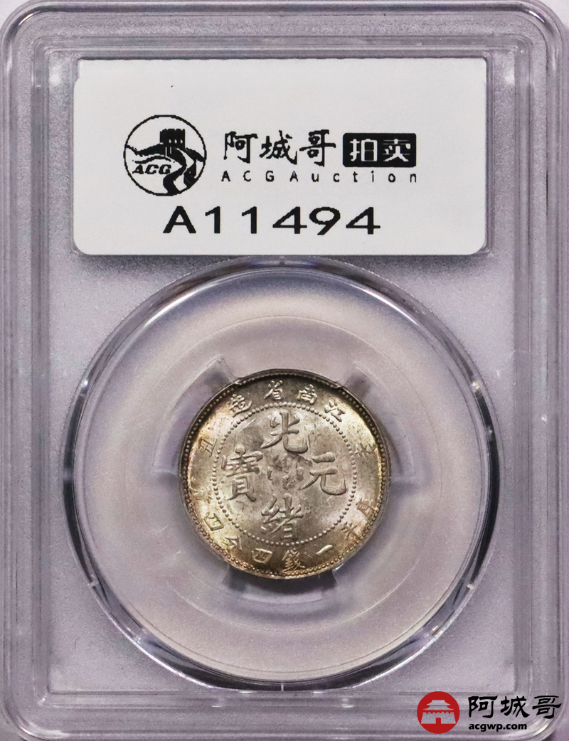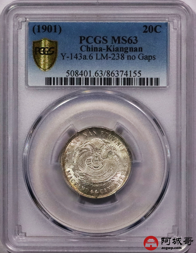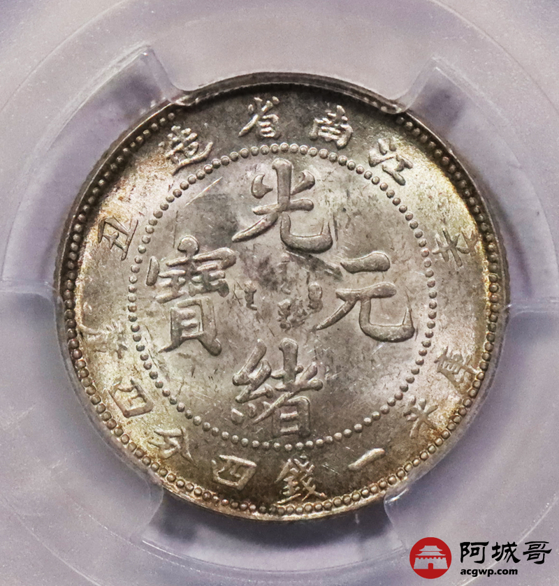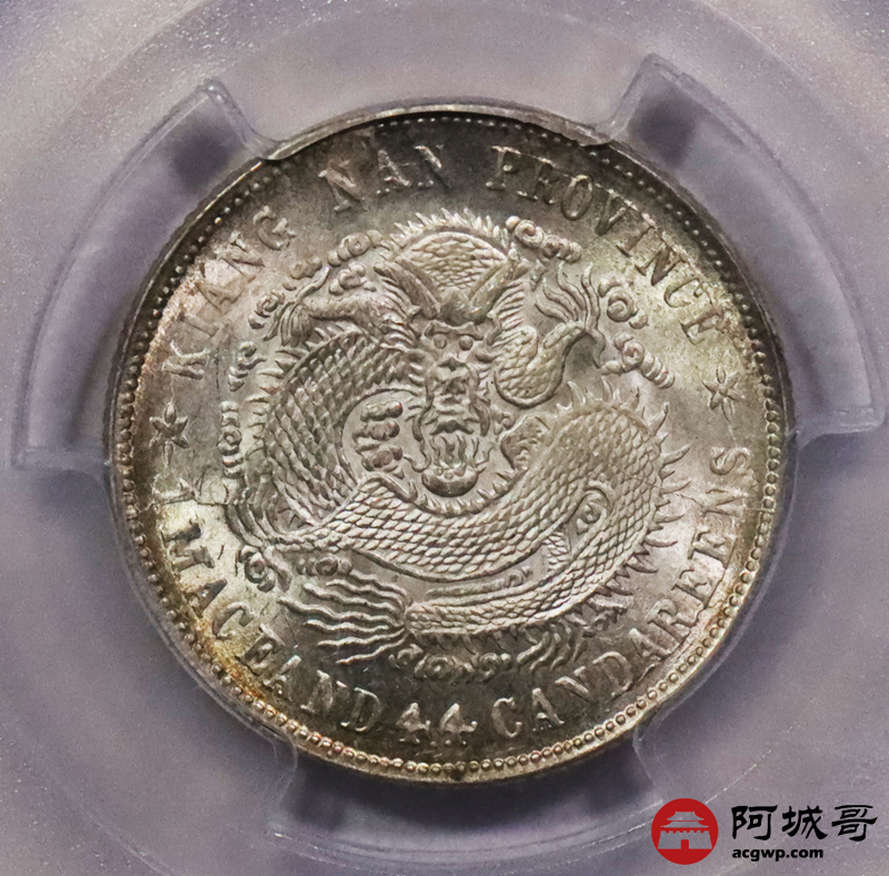 Lot:3372 1901辛丑年江南省造光绪元宝库平一钱四分四厘银币一枚,黄油淡彩底板,龙鳞锐利 PCGS MS63