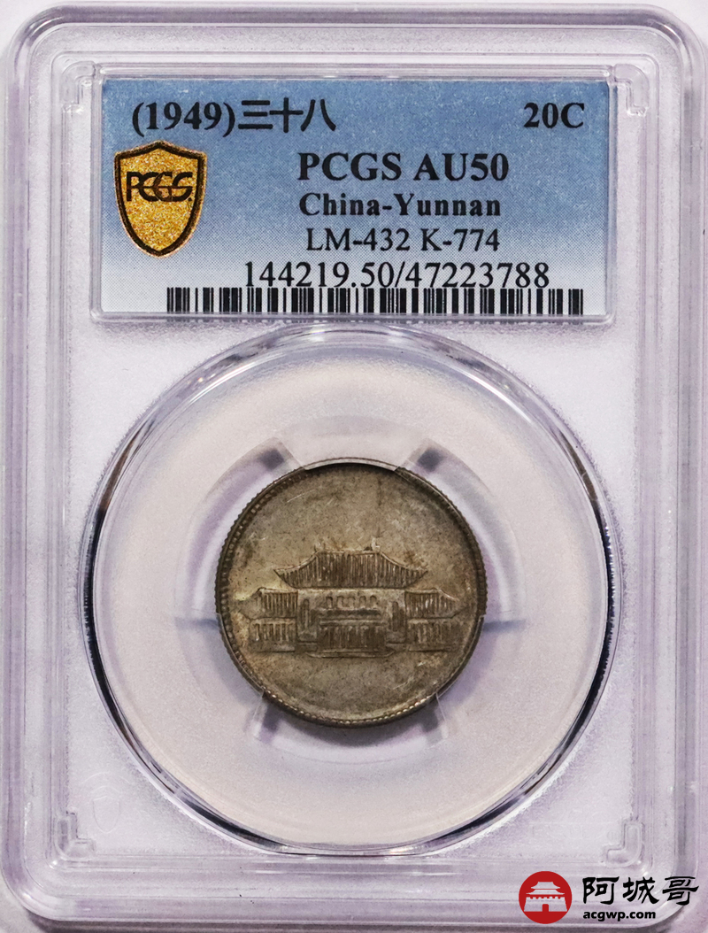 Lot:3432 1949民国三十八年云南省造贰角银币一枚,原汁原味PCGS AU50