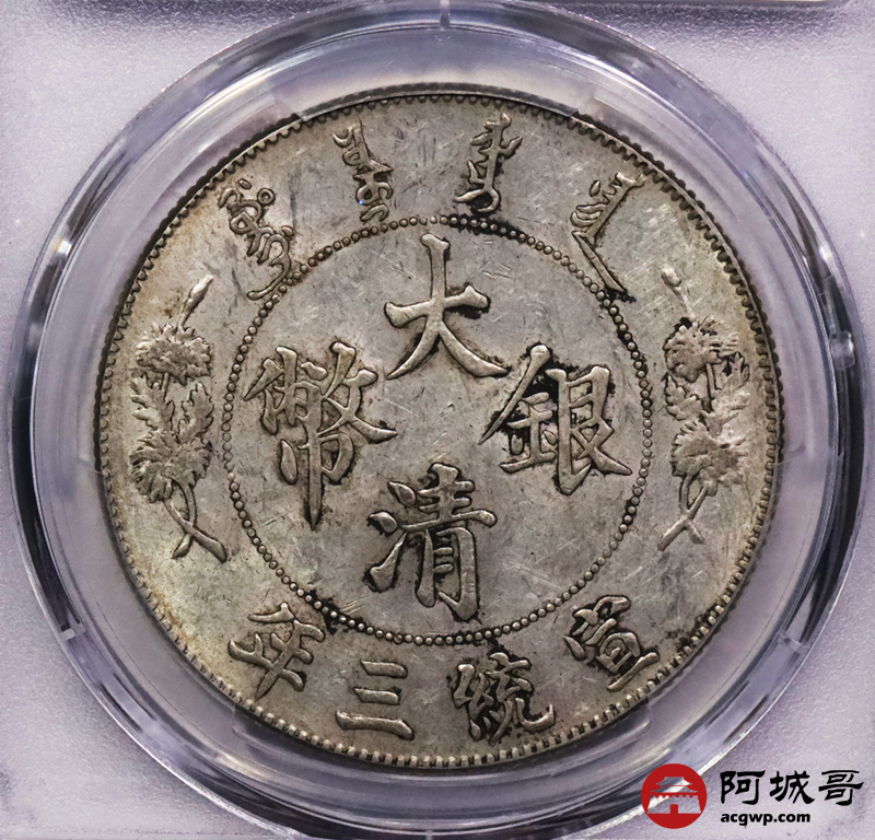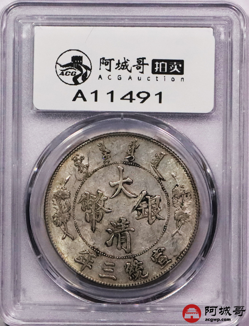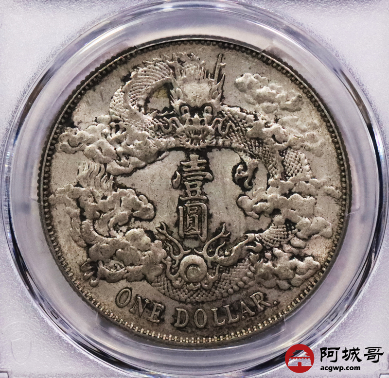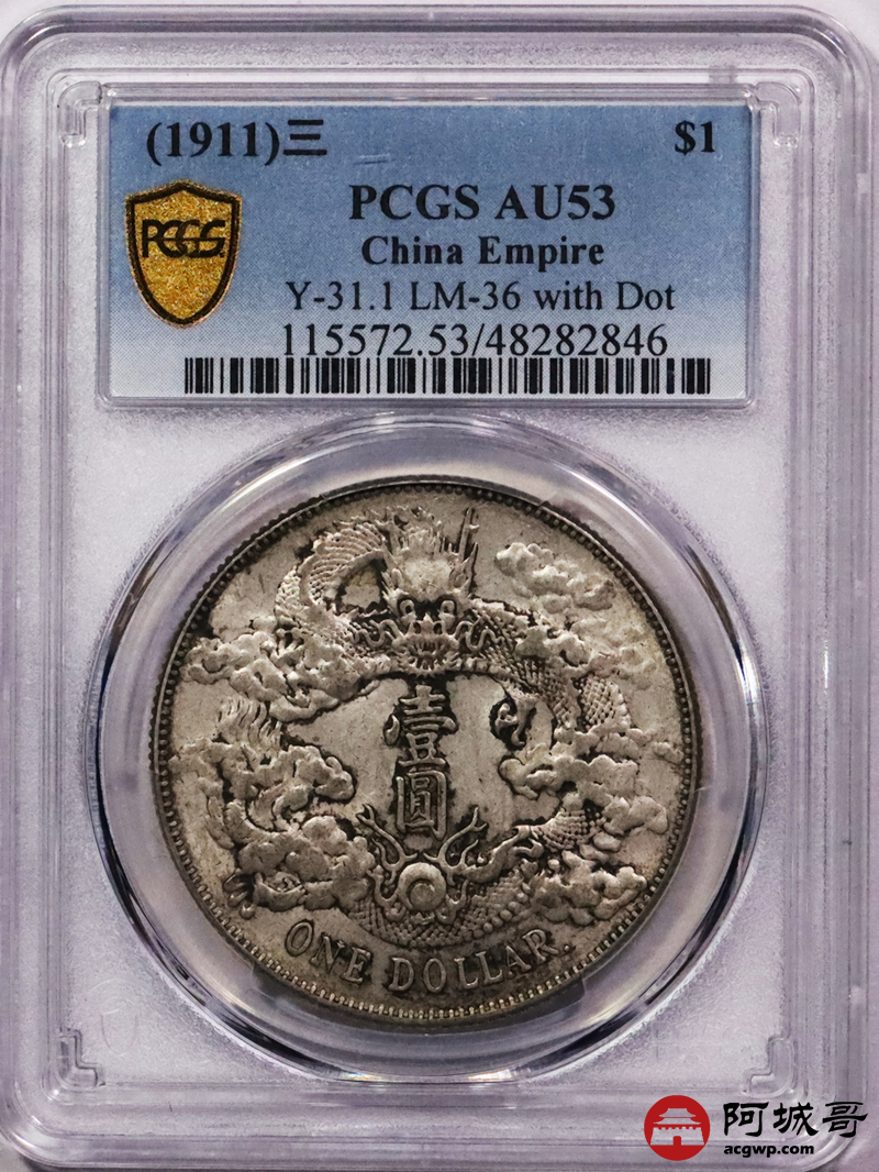 Lot:3037 1911宣统三年大清壹圆银币一枚,R后点版,原汁原味,黄油包浆 PCGS AU53