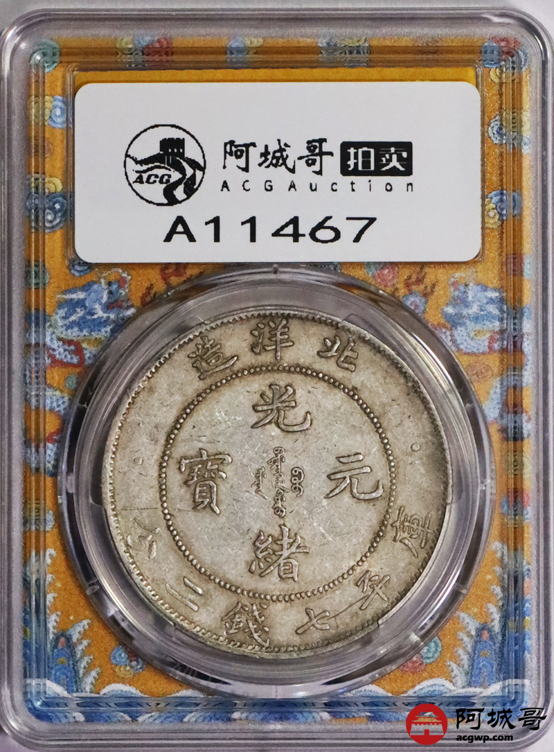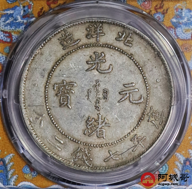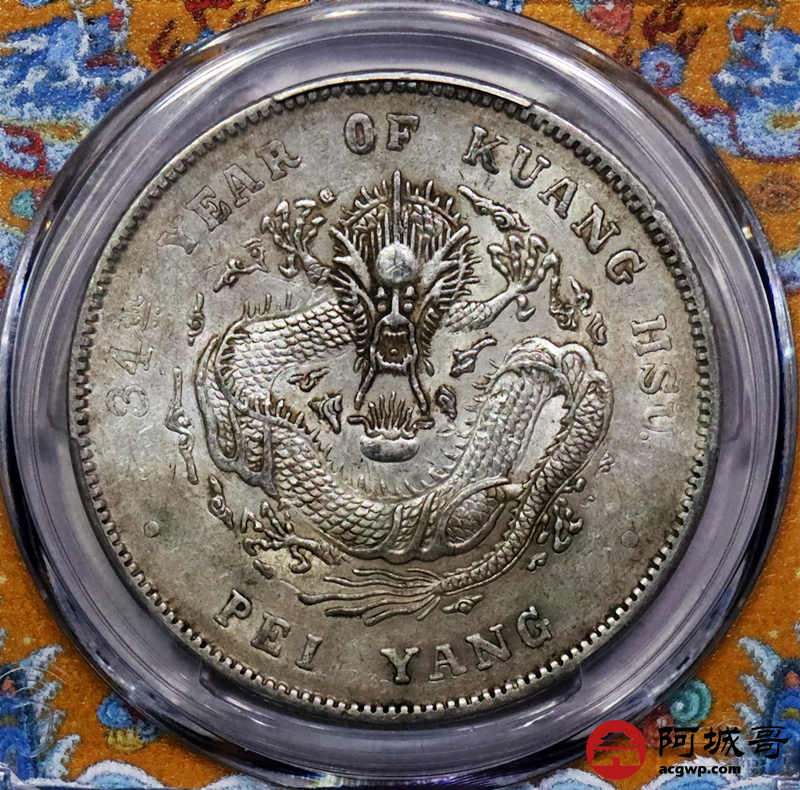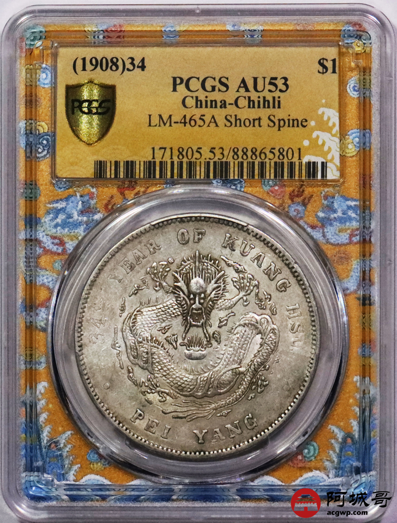 Lot:3301 1908光绪三十四年北洋造光绪元宝库平七钱二分银币一枚,短尾龙版,黄油底板 PCGS AU53