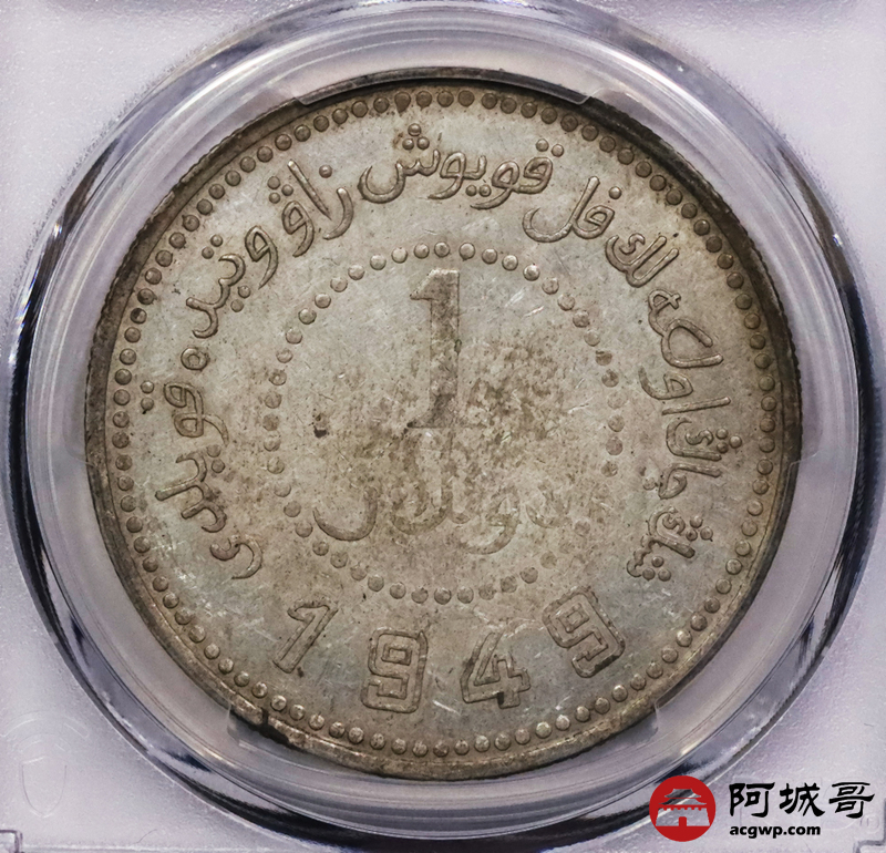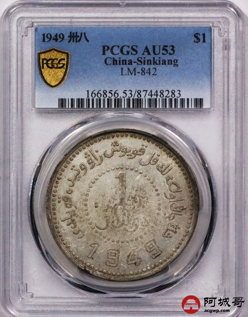 Lot:3453 1949民国三十八年新疆省造币厂铸壹圆银币一枚,黄油转光全深打PCGS AU53