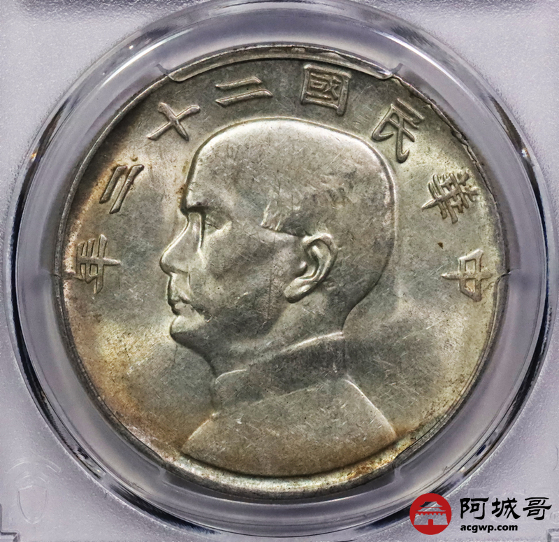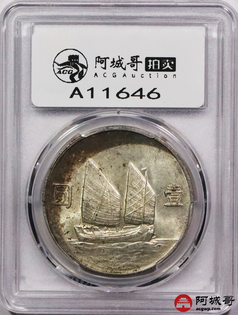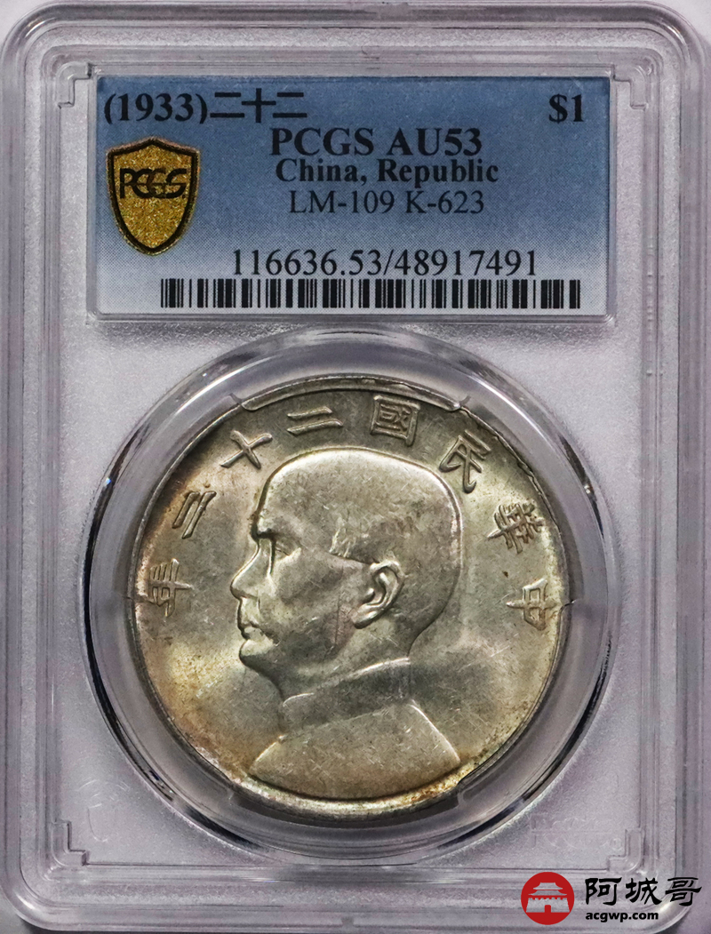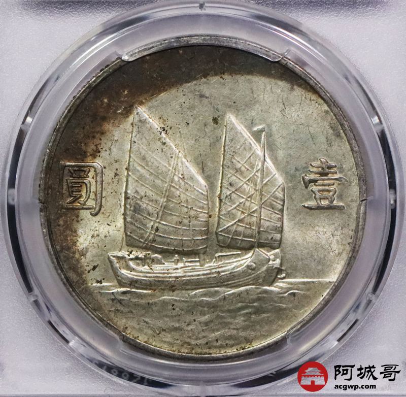 Lot:3199 1933民国二十二年孙中山像背帆船壹圆银币一枚,黄油转光PCGS AU53
