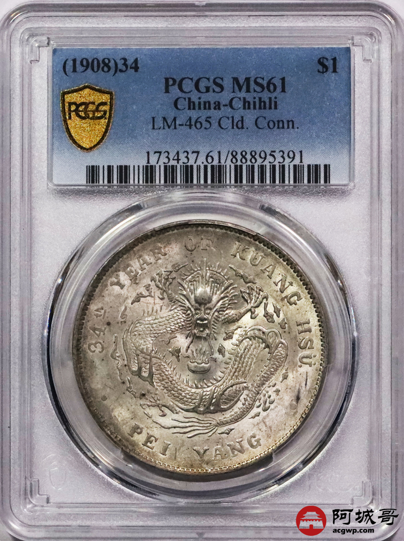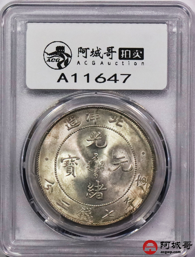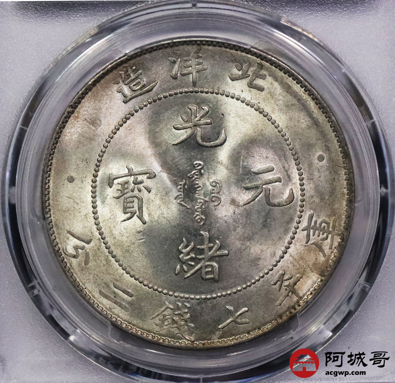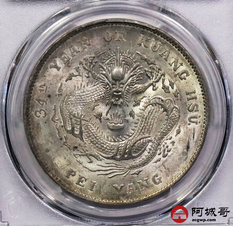 Lot:3294 1908光绪三十四年北洋造光绪元宝库平七钱二分银币一枚,原光深打,高额头满龙鳞PCGS MS61