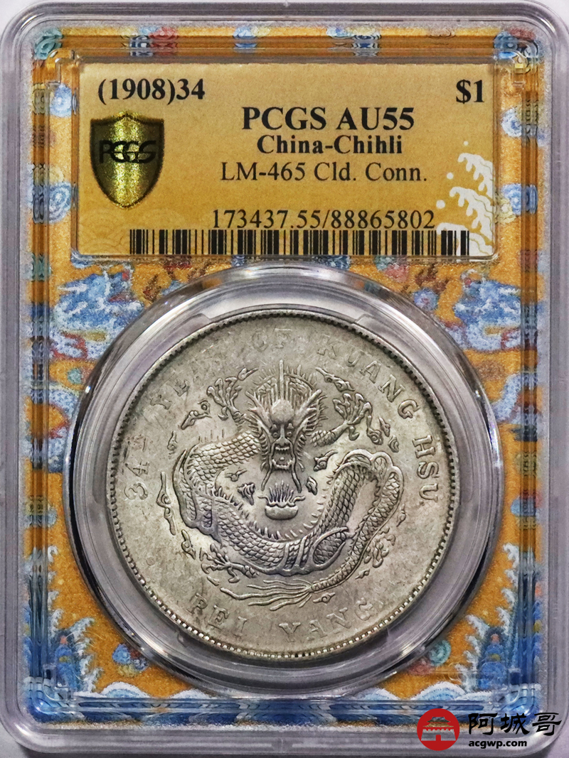 Lot:3299 1908光绪三十四年北洋造光绪元宝库平七钱二分银币一枚,黄油转光PCGS AU55