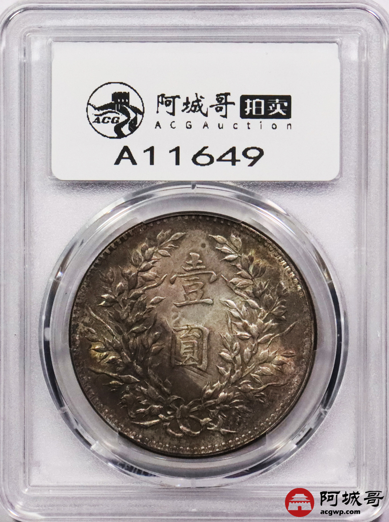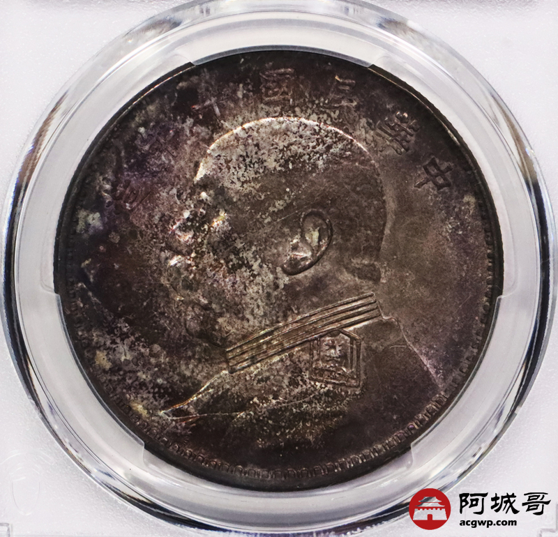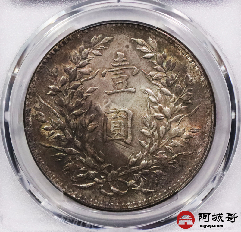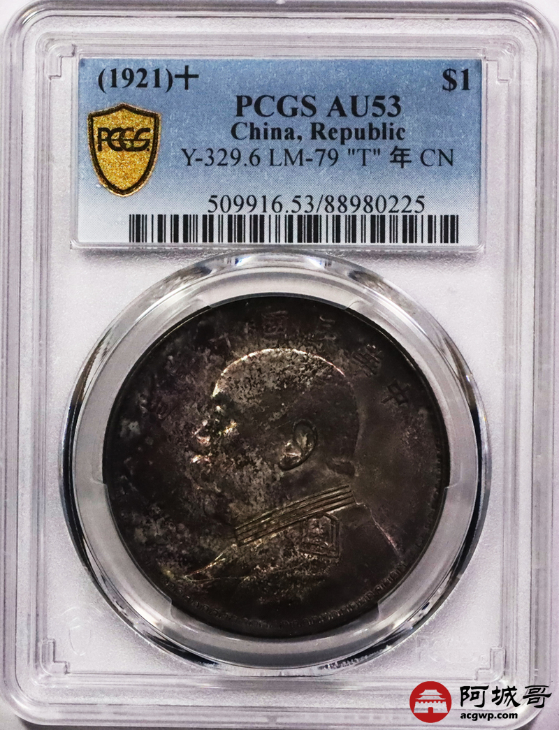 Lot:3530 1921民国十年袁世凯像壹圆银币一枚,卷首五彩包浆PCGS AU53