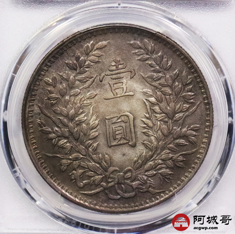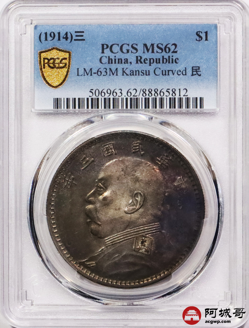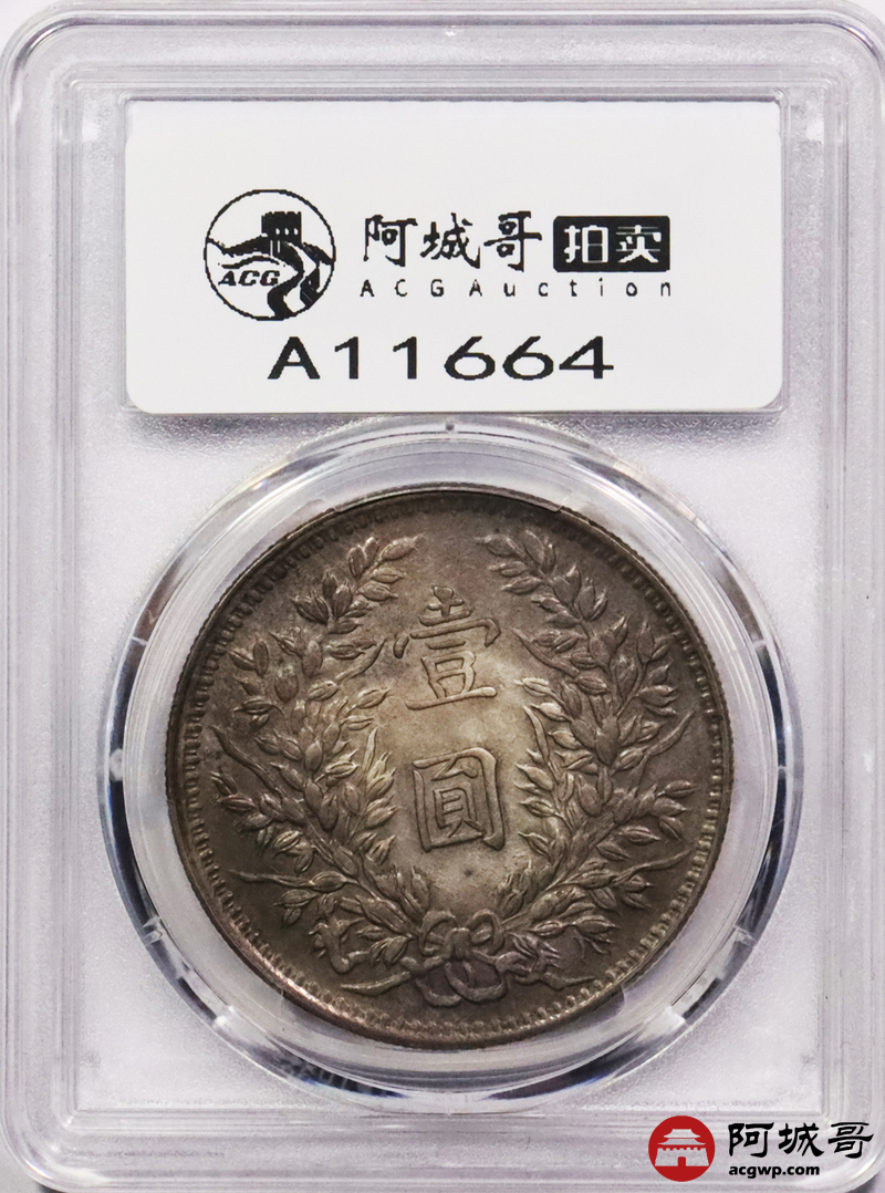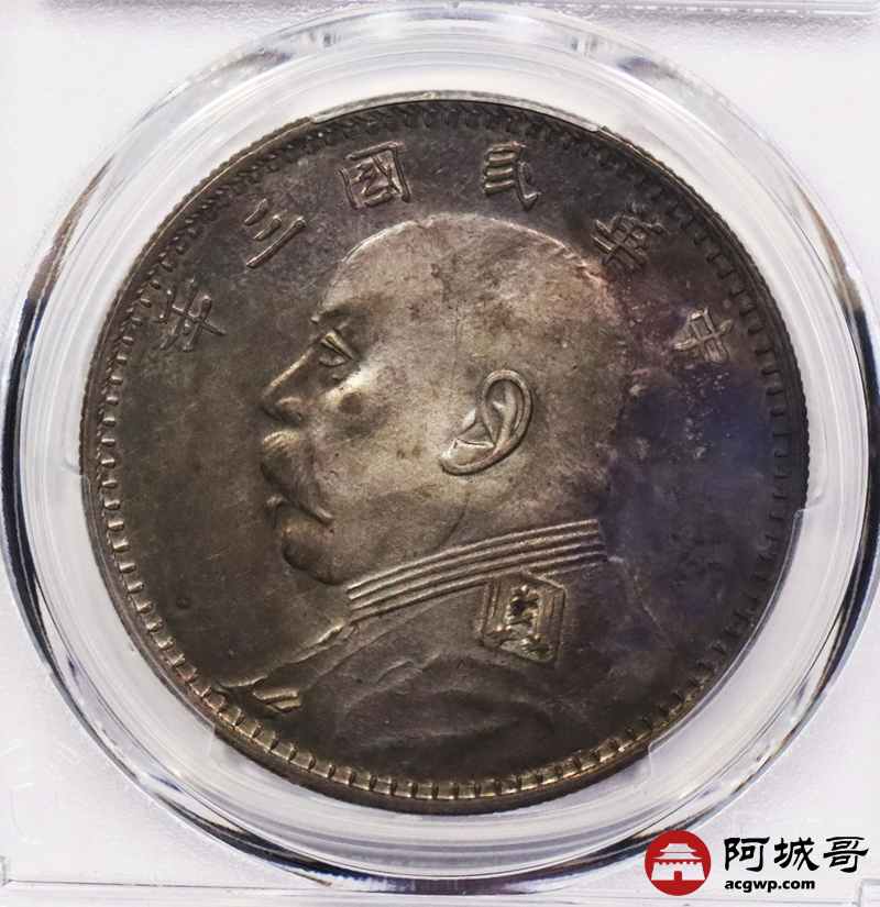 Lot:3465 1914民国三年袁世凯像壹圆银币一枚,酱五彩包浆,甘肃曲笔民版,状态难得PCSG MS62