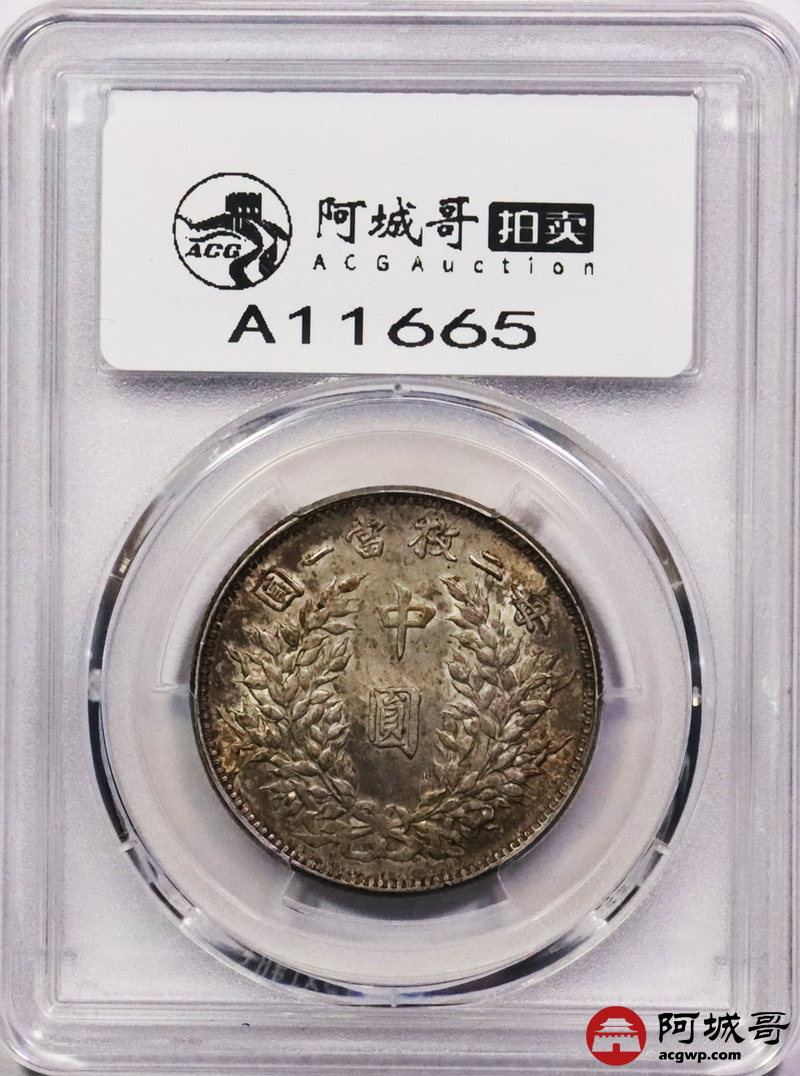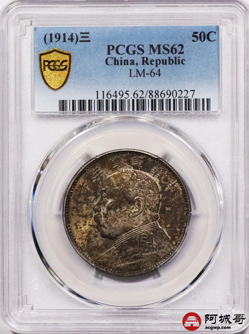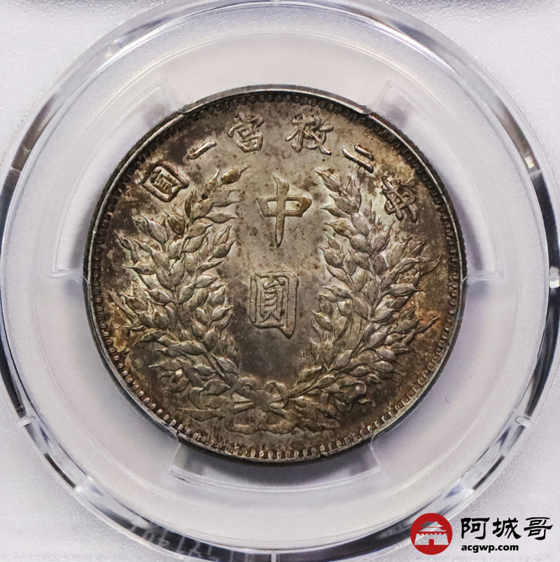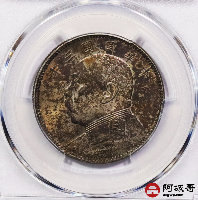 Lot:3129 1914民国三年袁世凯像中圆银币一枚,原光酱五彩包浆,发丝清晰PCGS MS62