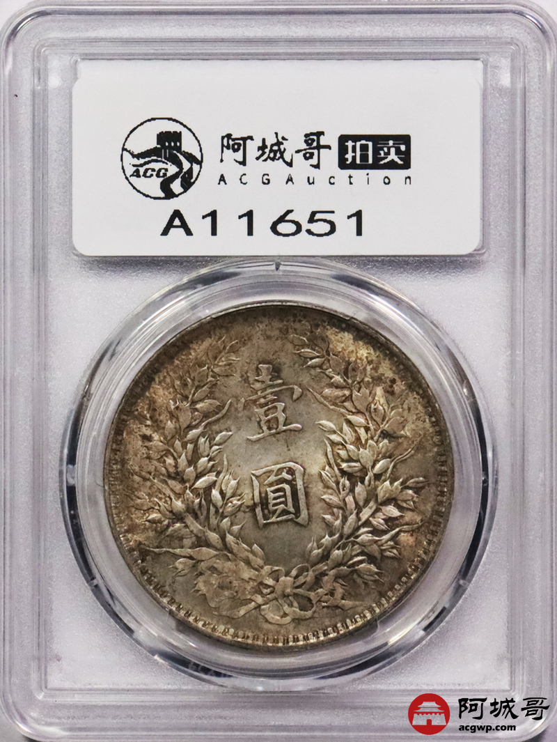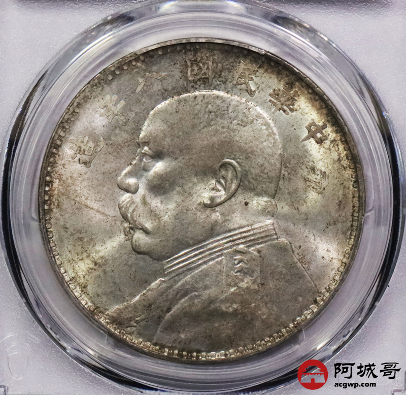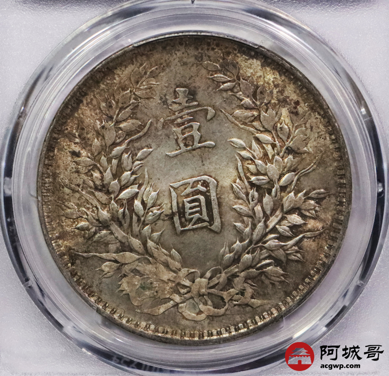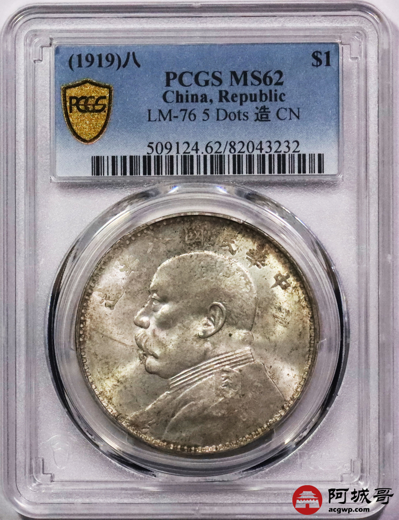 Lot:3135 1919民国八年袁世凯像壹圆银币一枚,粉色原光淡彩,连口造下五珠PCGS MS62