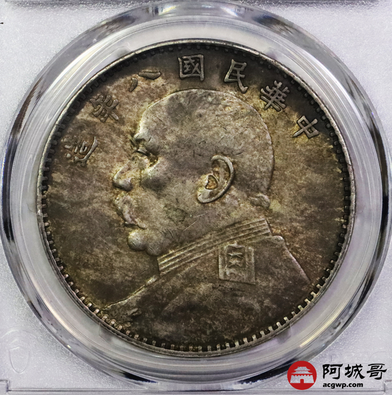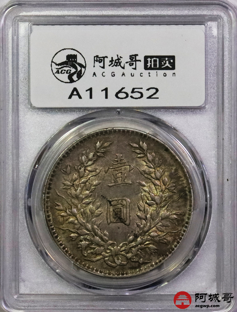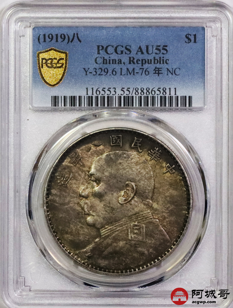 Lot:3136 1919民国八年袁世凯像壹圆银币一枚,底光酱彩包浆PCGS AU55