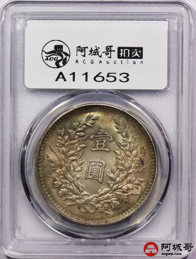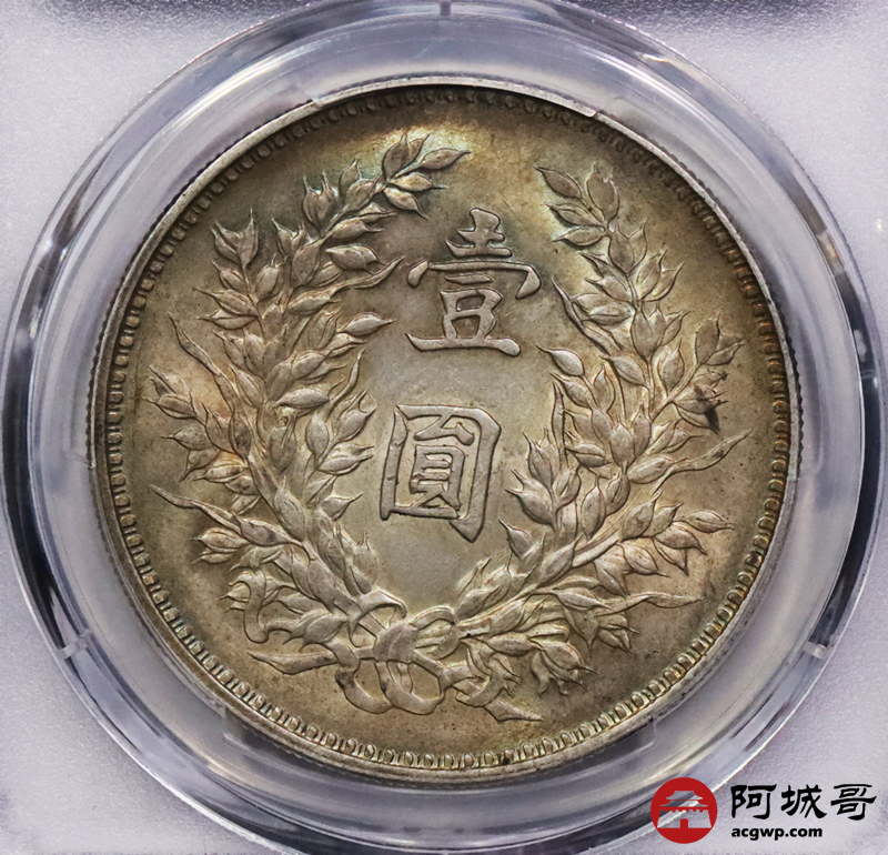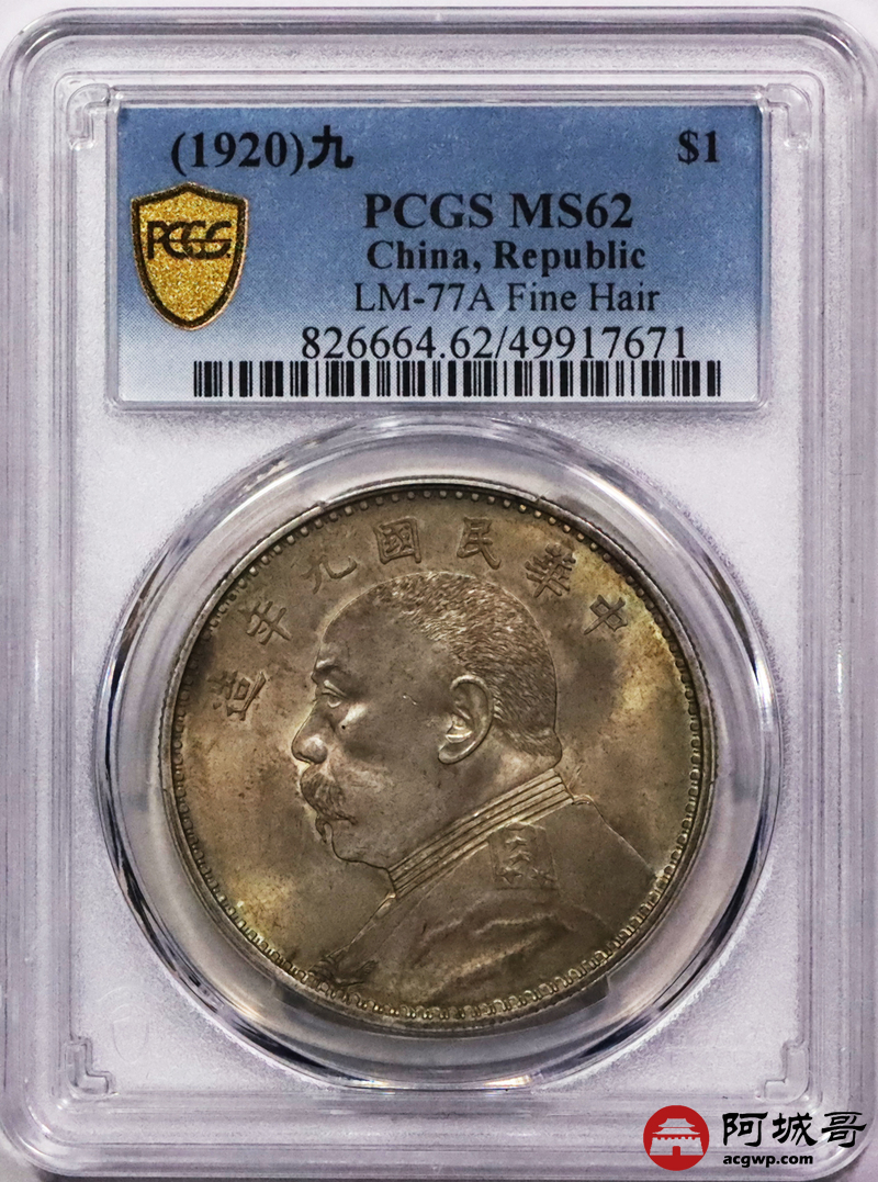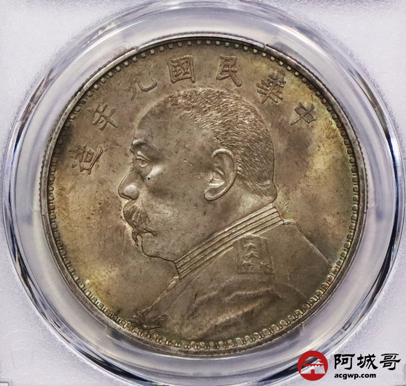 Lot:3516 1920民国九年袁世凯像壹圆银币一枚,黄油五彩包浆,发丝立体,精发版PCGS MS62