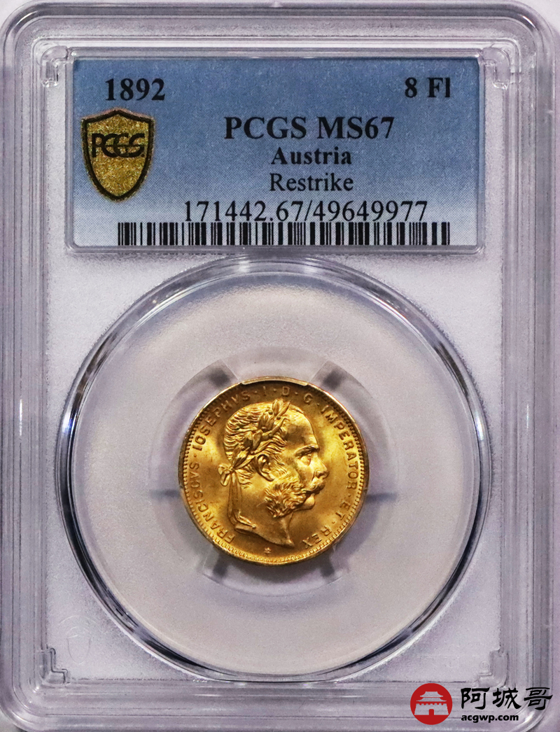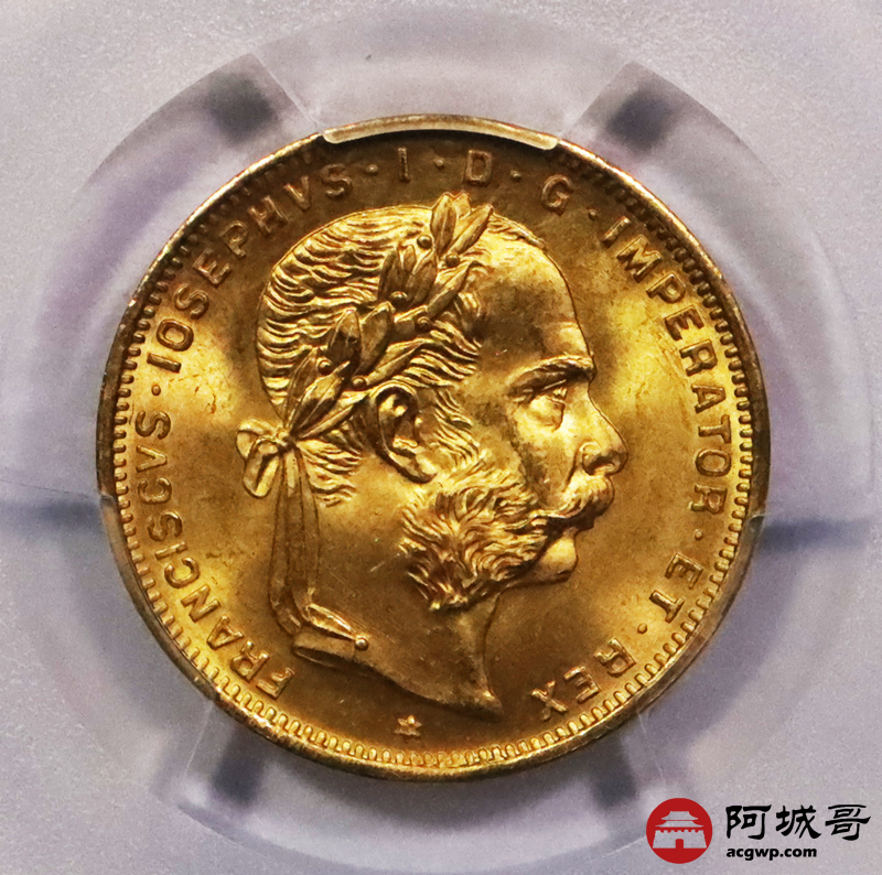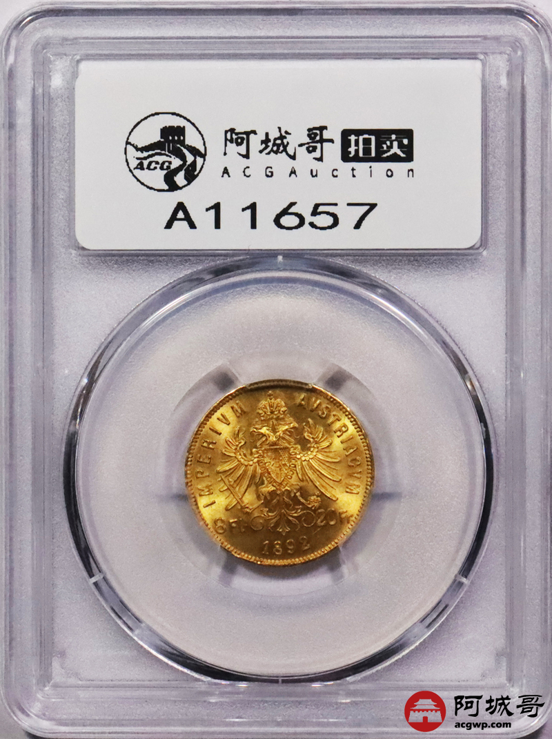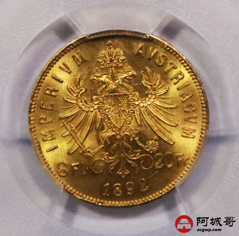 Lot:3669 1892年奥地利国王弗朗茨·约瑟夫一世像背双头鹰20法郎金币一枚PCGS MS67