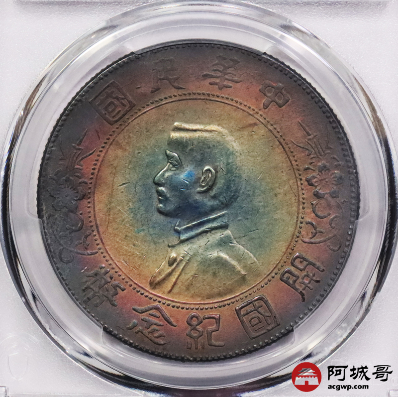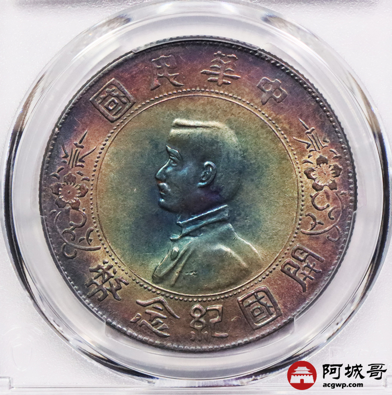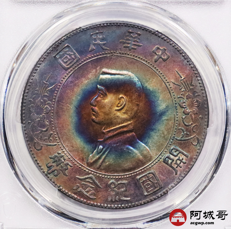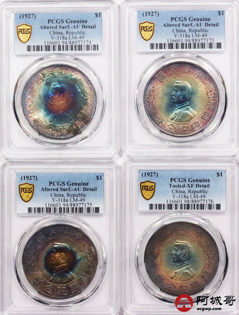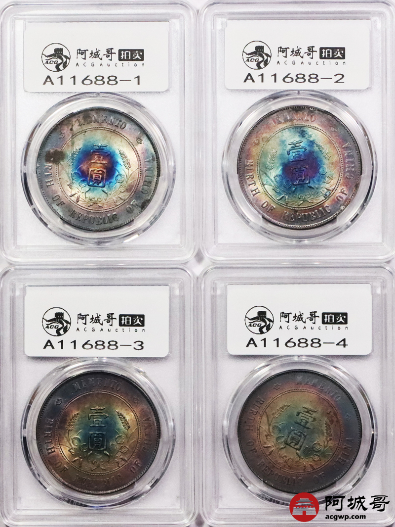 Lot:3634 1927孙中山像开国纪念壹圆银币,炫丽五彩包浆,四枚一组,评级结果不一 PCGS评级