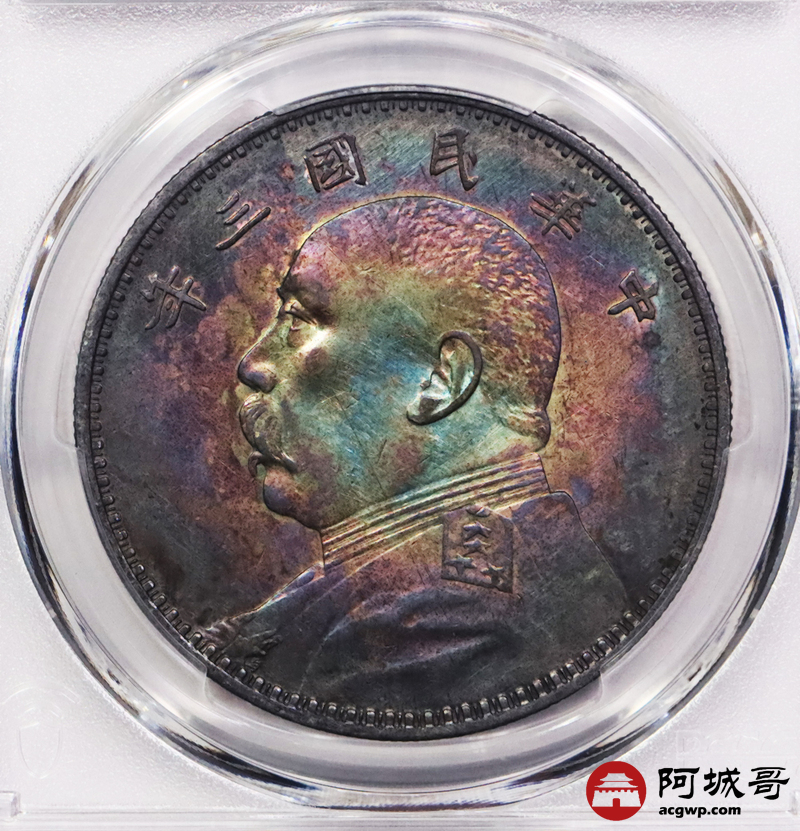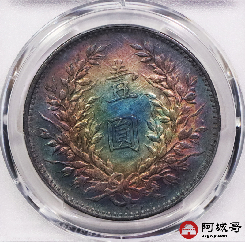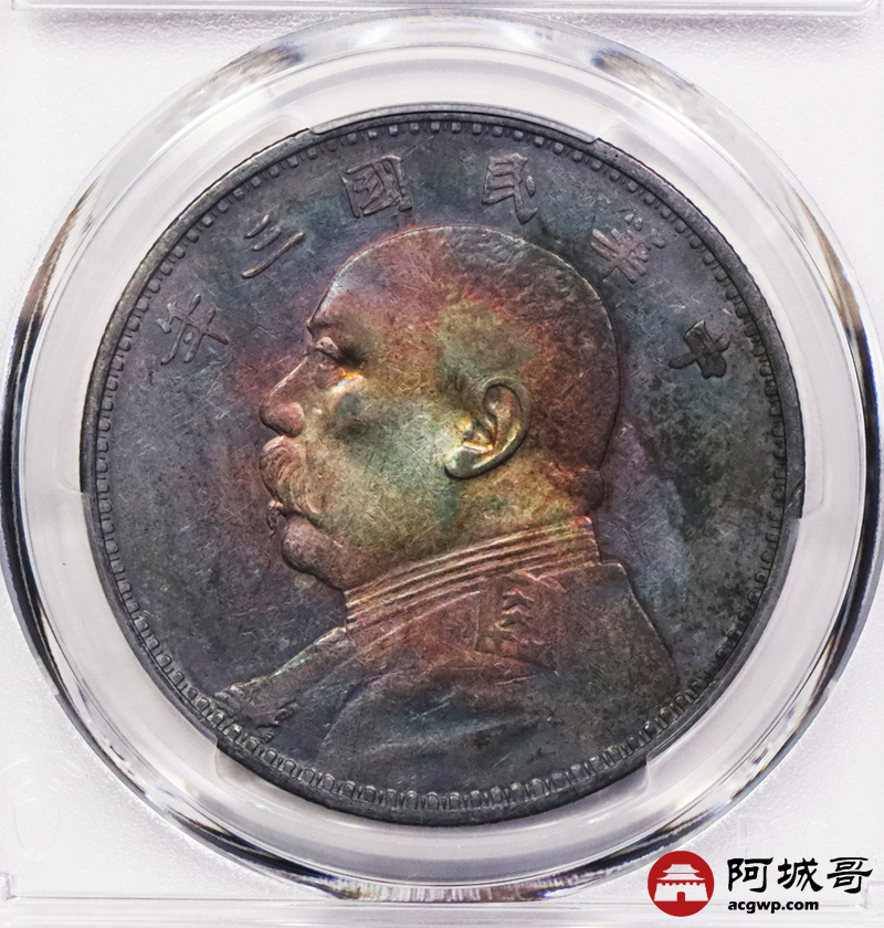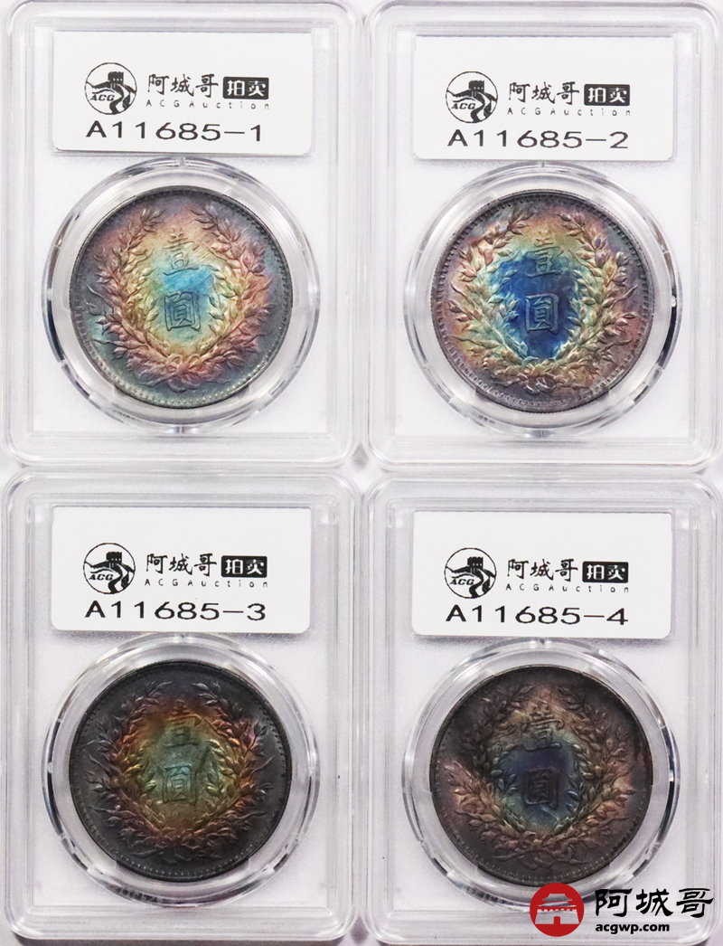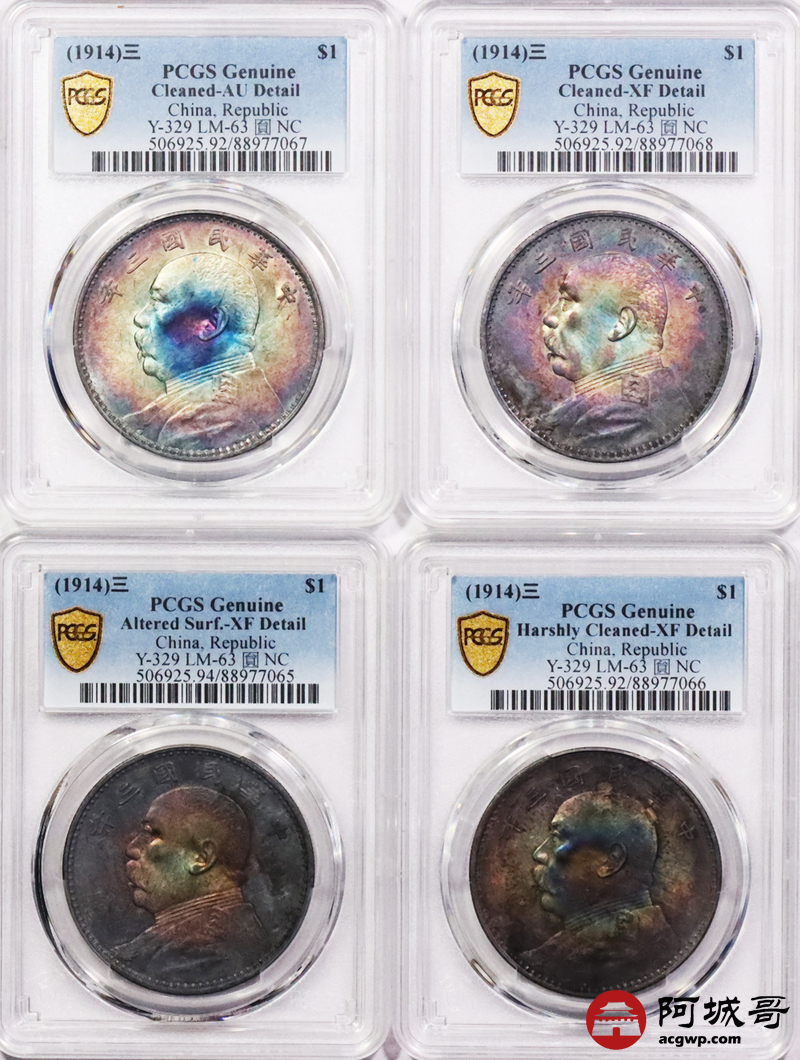 Lot:3637 1914民国三年袁世凯像壹圆银币,炫丽五彩包浆,四枚一组,评级结果不一 PCGS评级