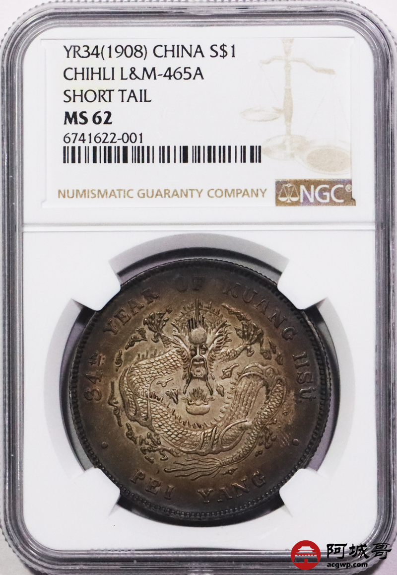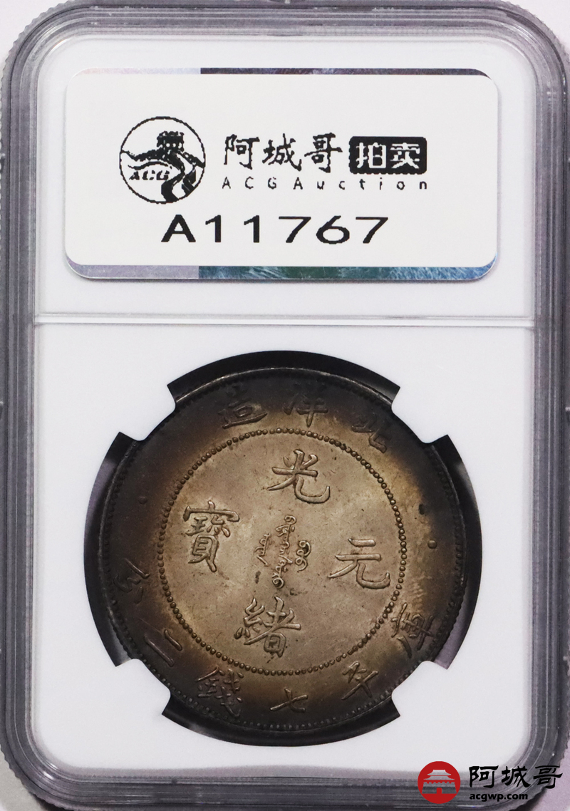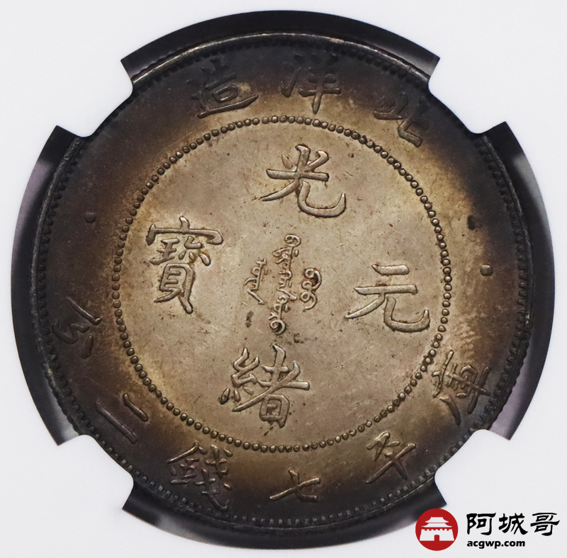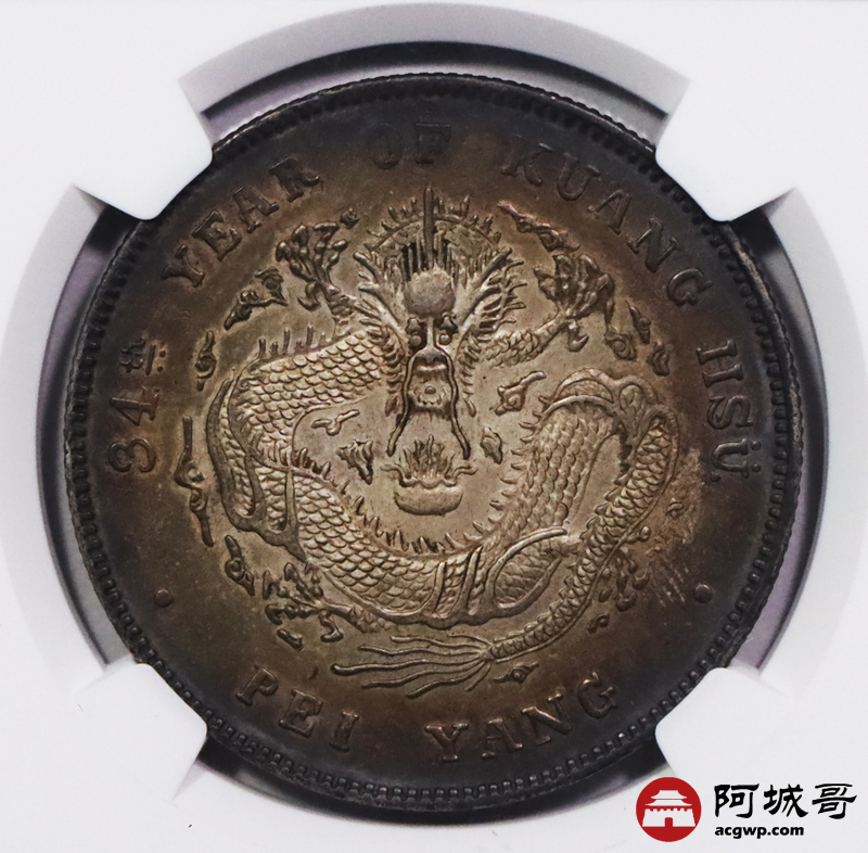 Lot:3295 1908光绪三十四年北洋造光绪元宝库平七钱二分银币一枚,环酱彩包浆,高额头,满龙鳞深打,短尾版NGC MS62