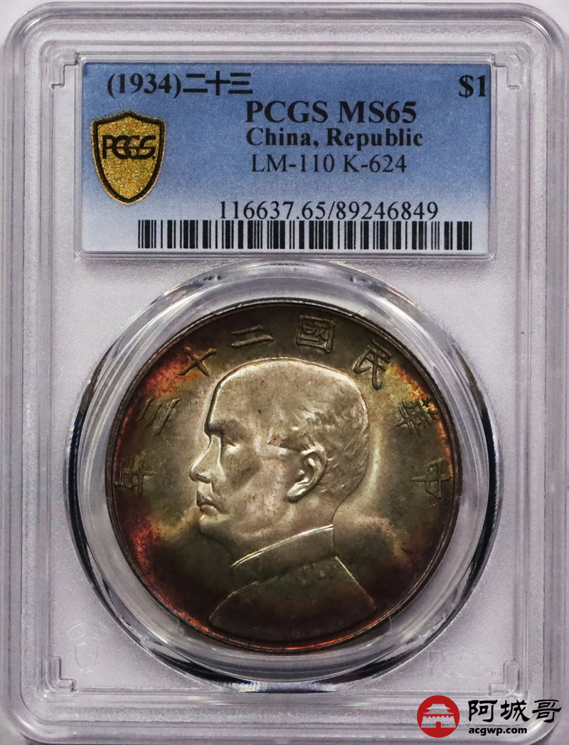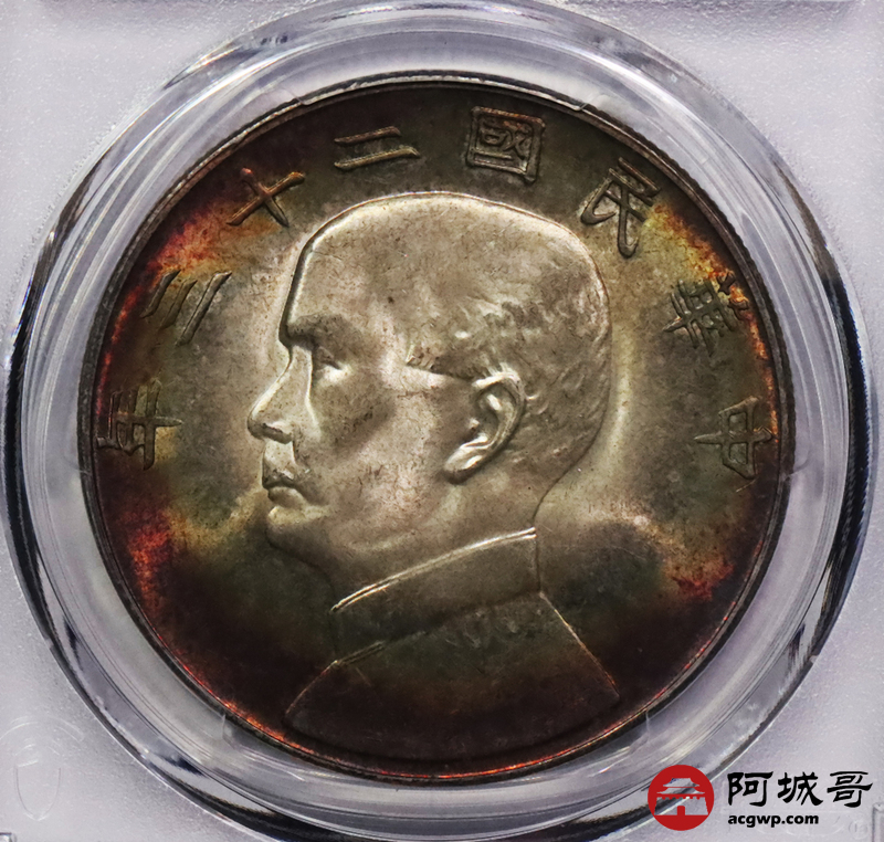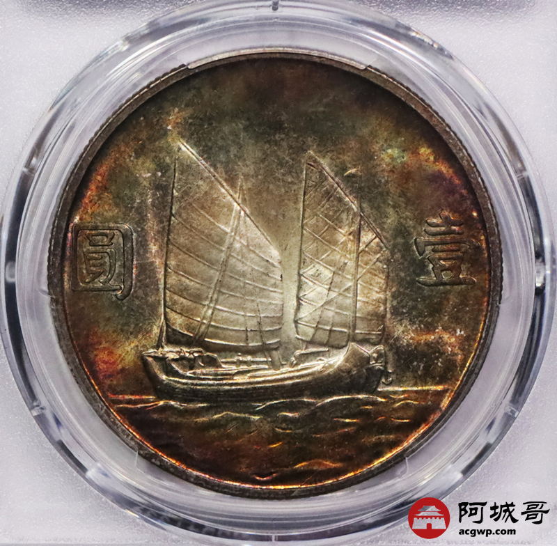 Lot:3201 1934民国二十三孙中山像背帆船壹圆银币一枚,弄堂五彩包浆,车轮转光 ,美轮美奂 PCGS MS65