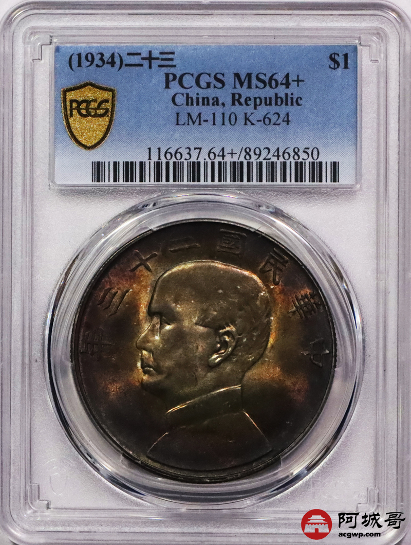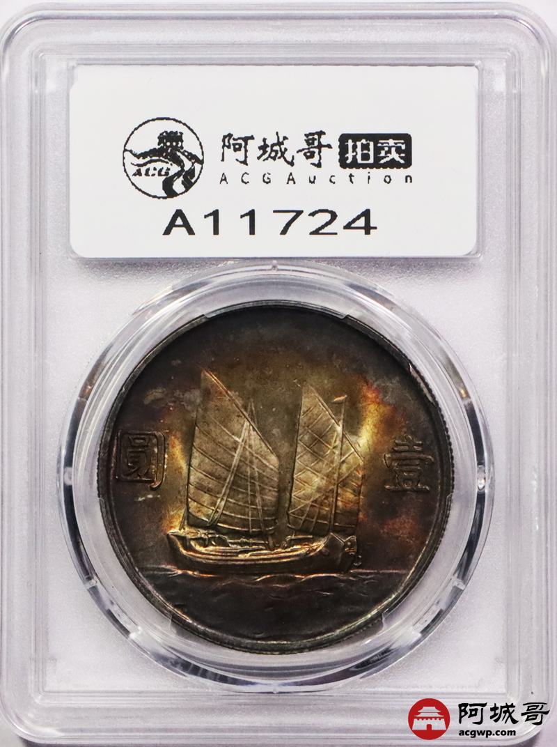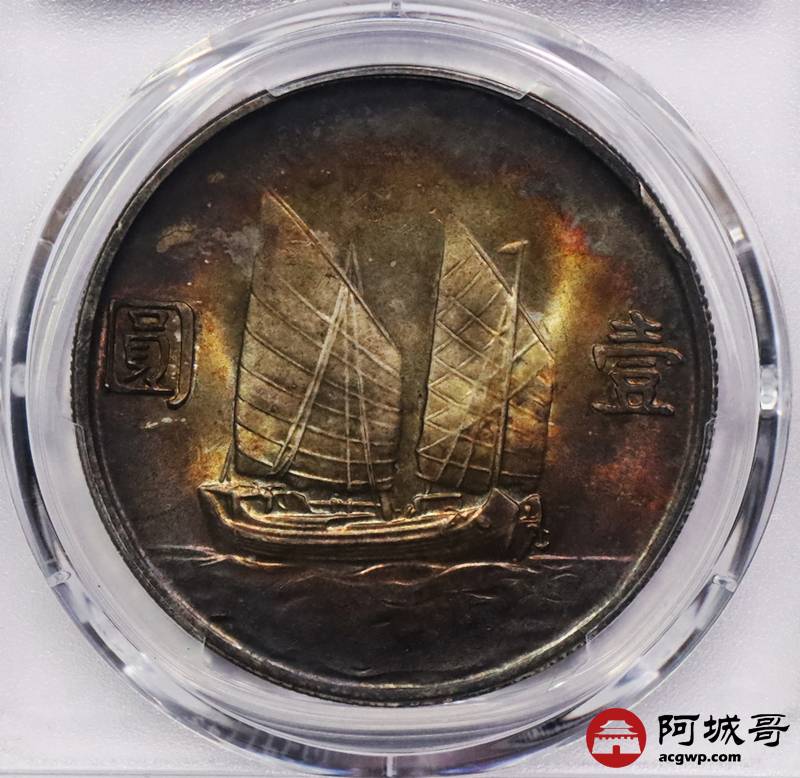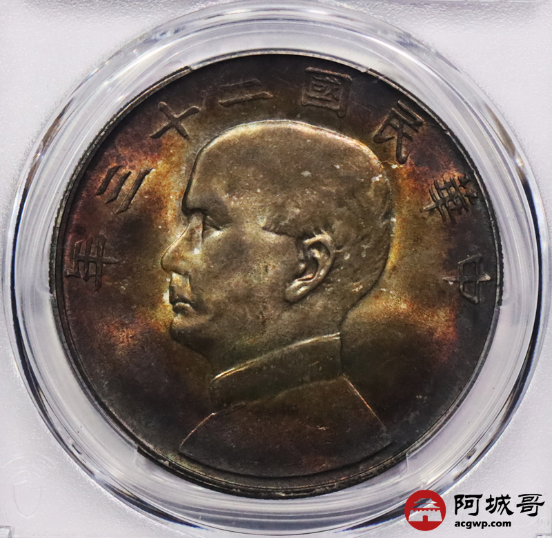 Lot:3203 1934民国二十三孙中山像背帆船壹圆银币一枚,浓郁酱红老五彩,味道一流 PCGS MS64+