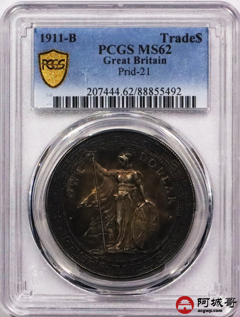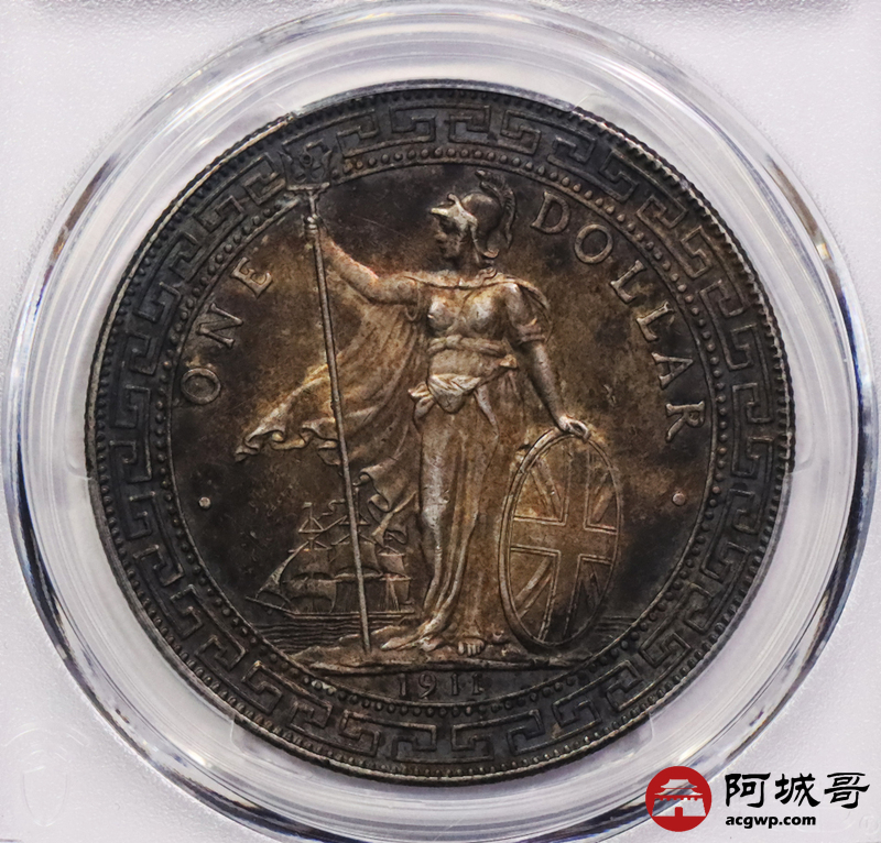Lot:3735 1911-B英属贸易站洋壹圆银币一枚,双面入骨酱彩包浆 PCGS MS62
