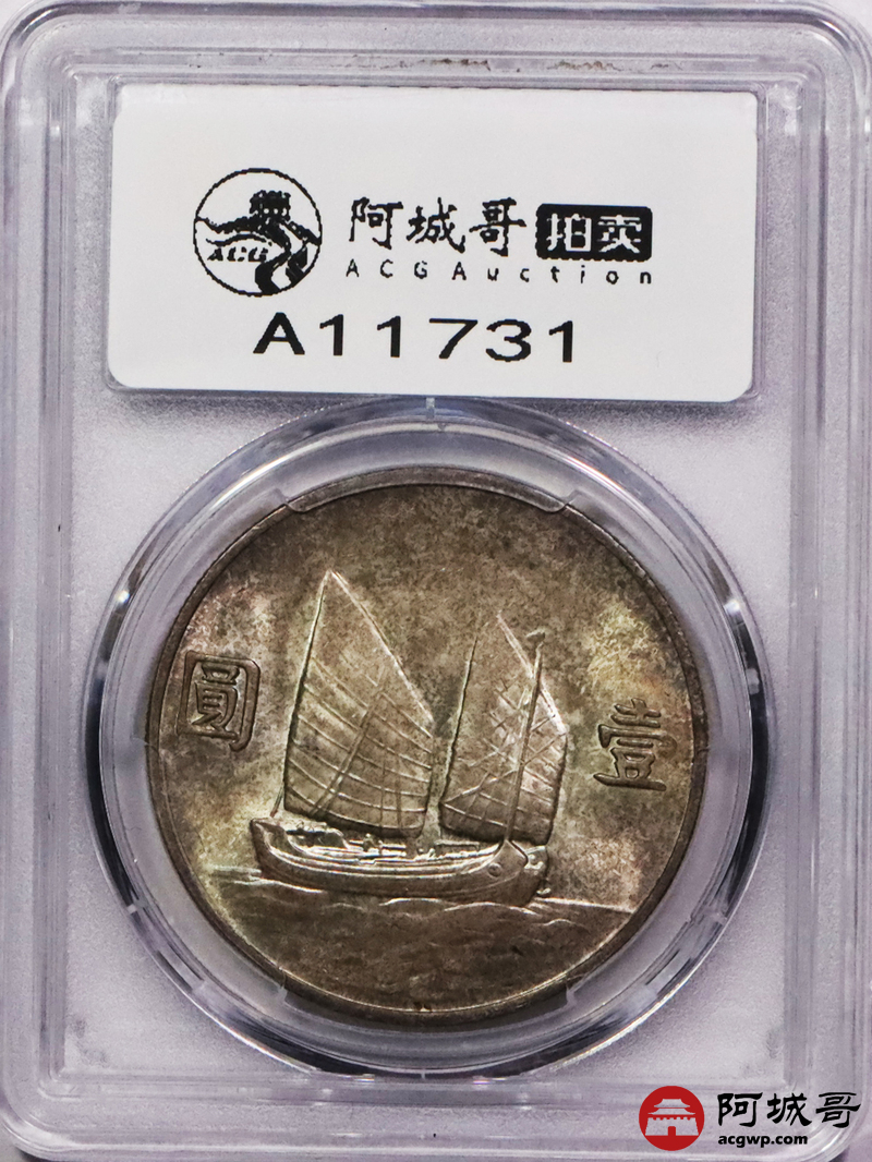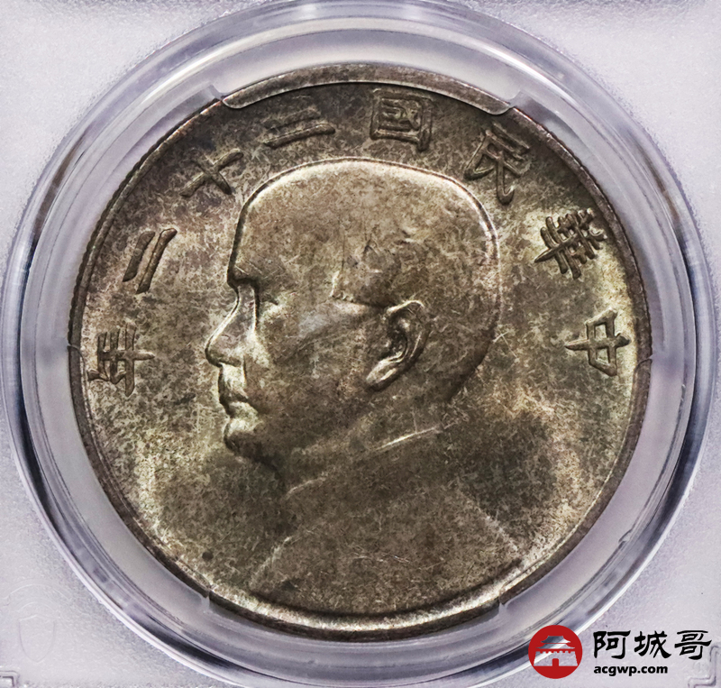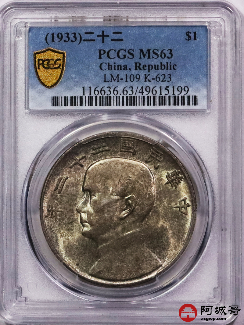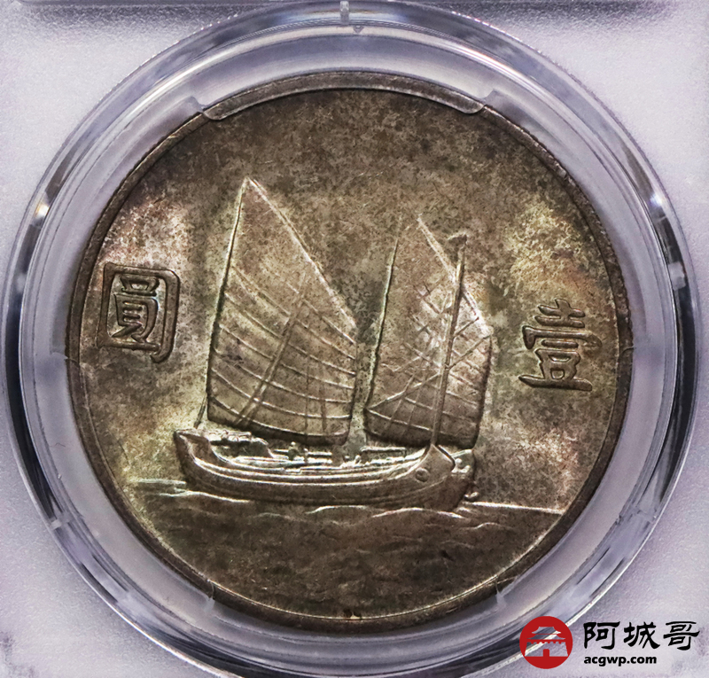 Lot:3197 1933民国二十二年孙中山像背帆船壹圆银币一枚,原光淡彩底板 PCGS MS63