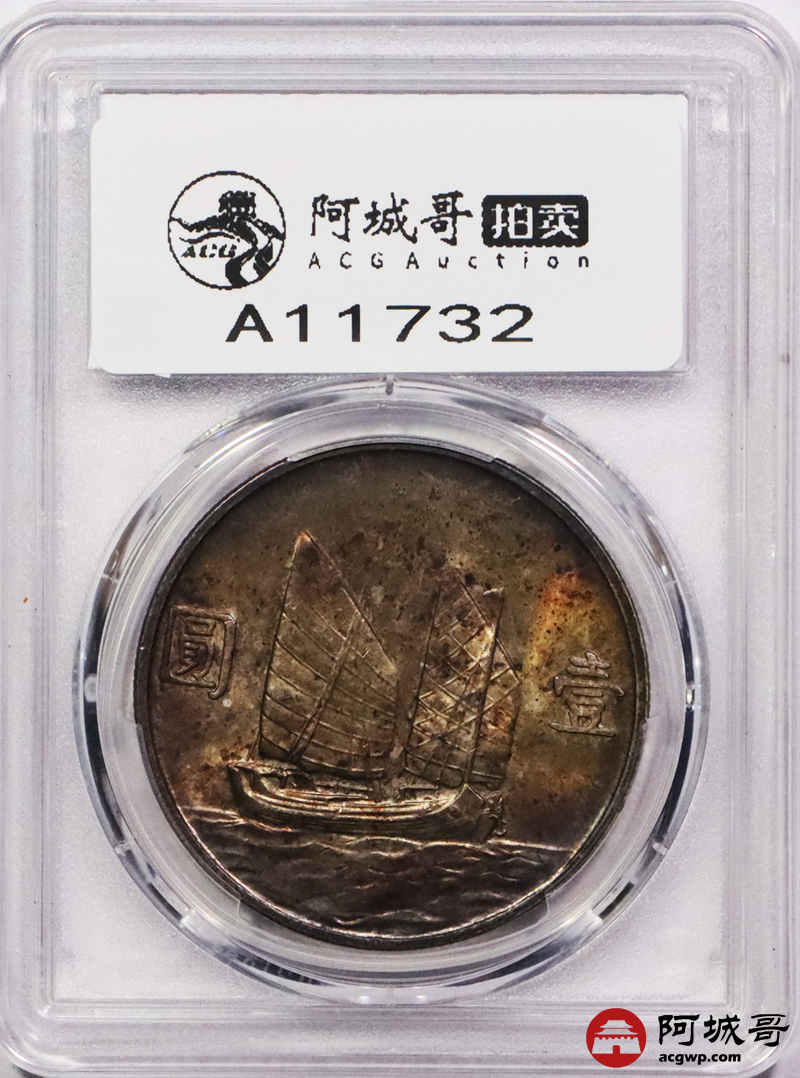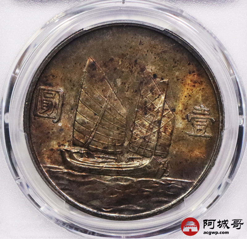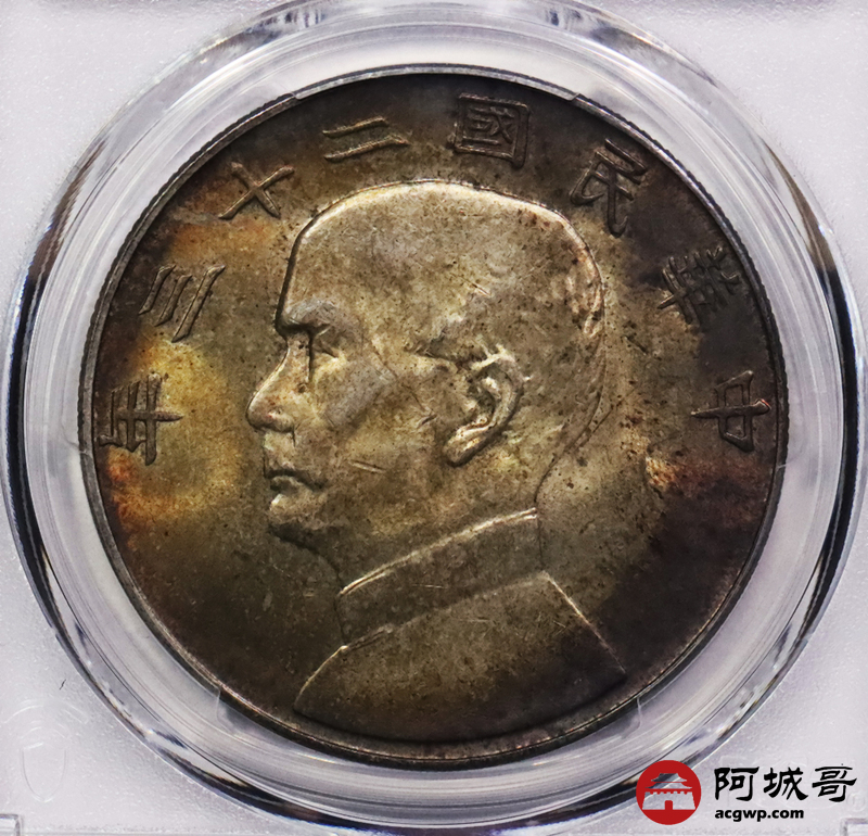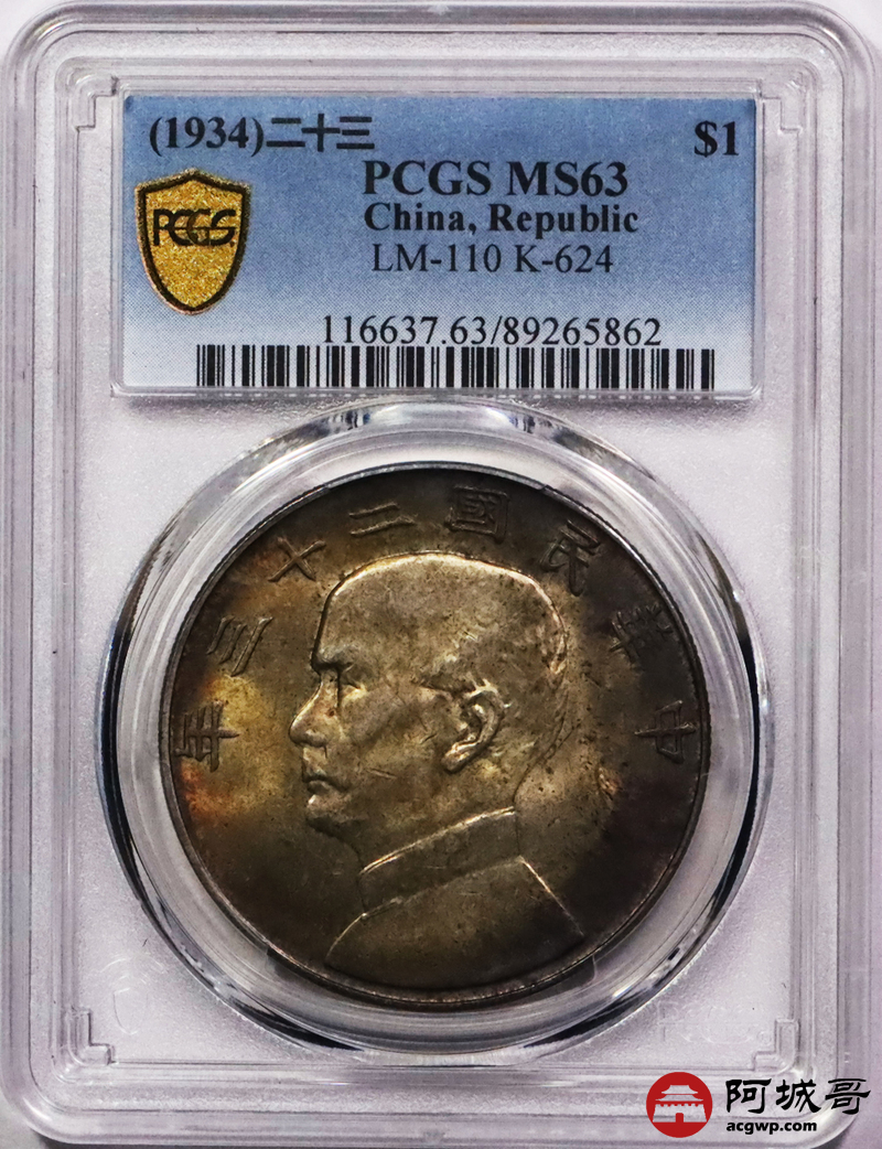 Lot:3563 1934民国二十三年孙中山像壹圆银币一枚,五彩包浆 PCGS MS63