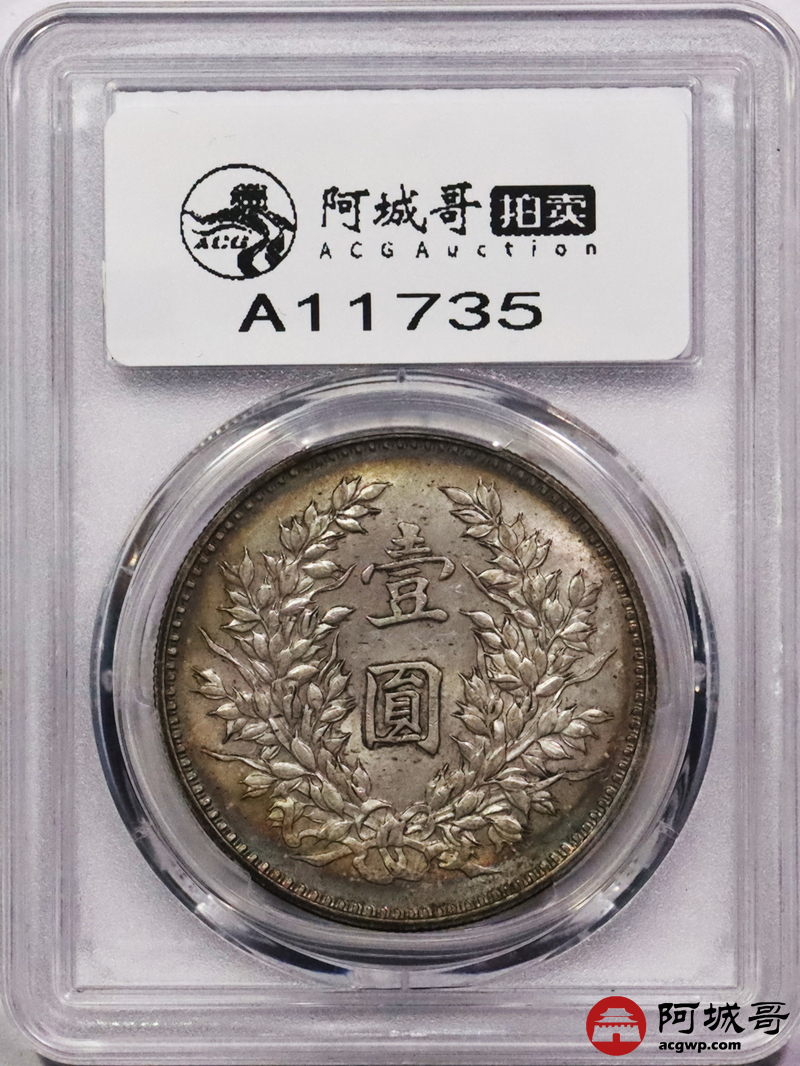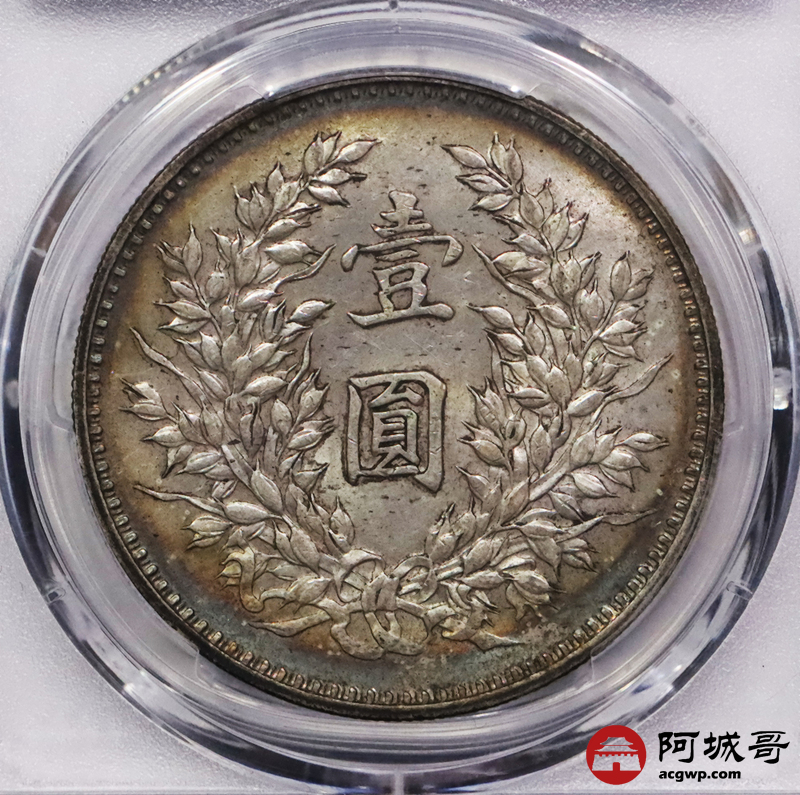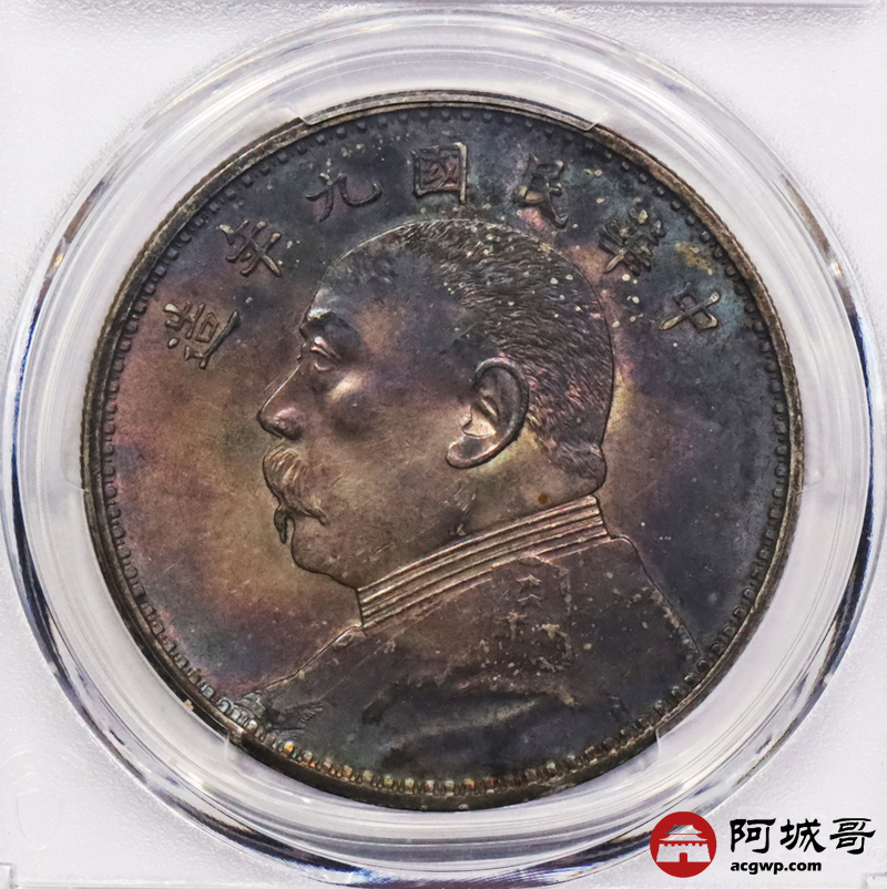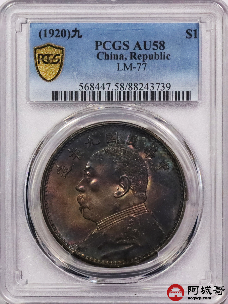 Lot:3522 1920民国九年袁世凯像壹圆银币一枚,精发版,卷首酱彩包浆 PCGS AU58