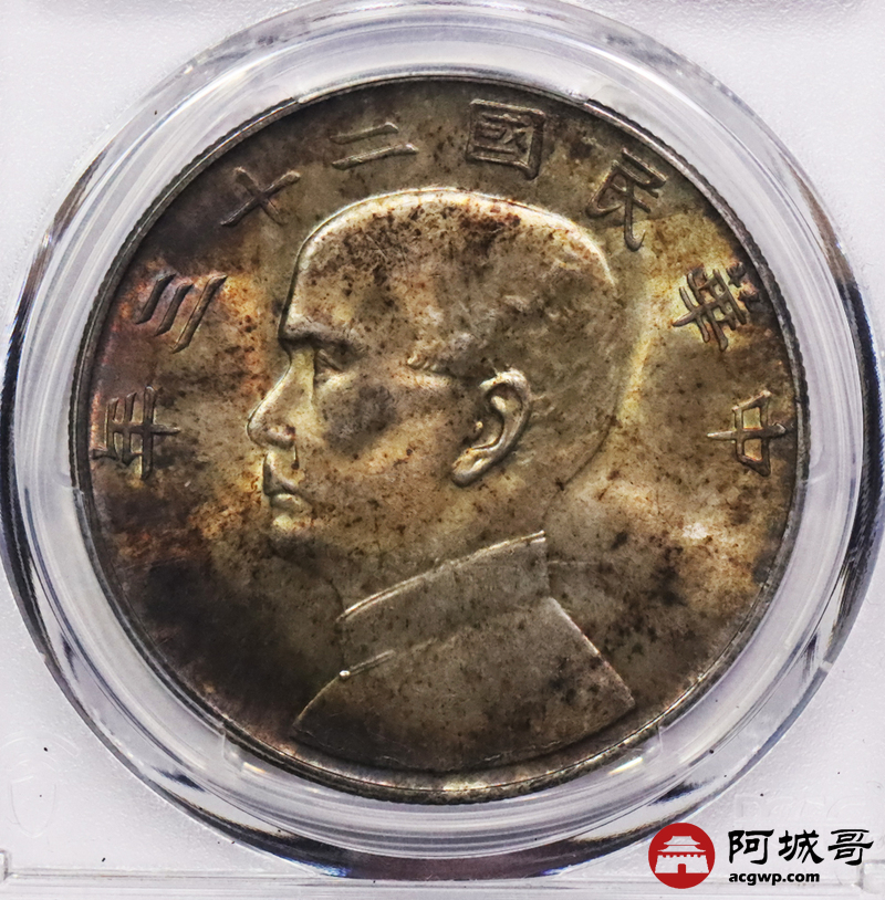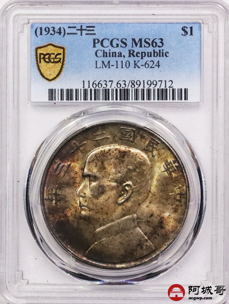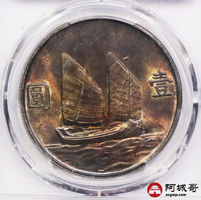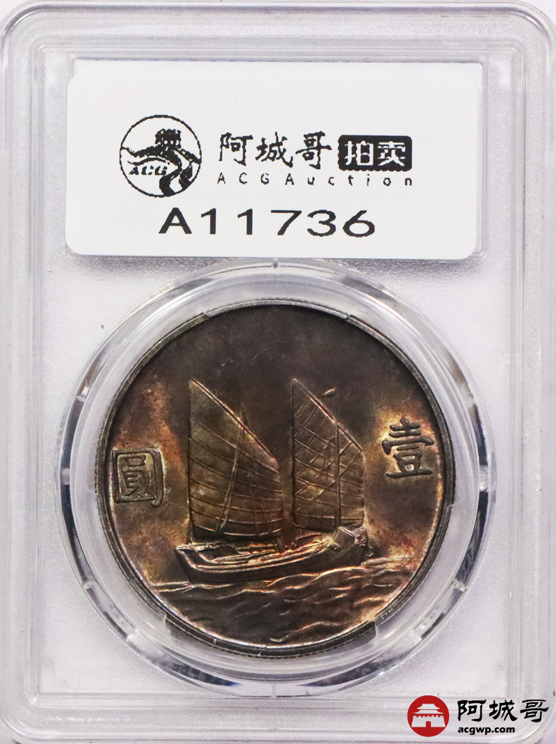 Lot:3562 1934民国二十三年孙中山像背帆船壹圆银币一枚,酱红五彩包浆 PCGS M63