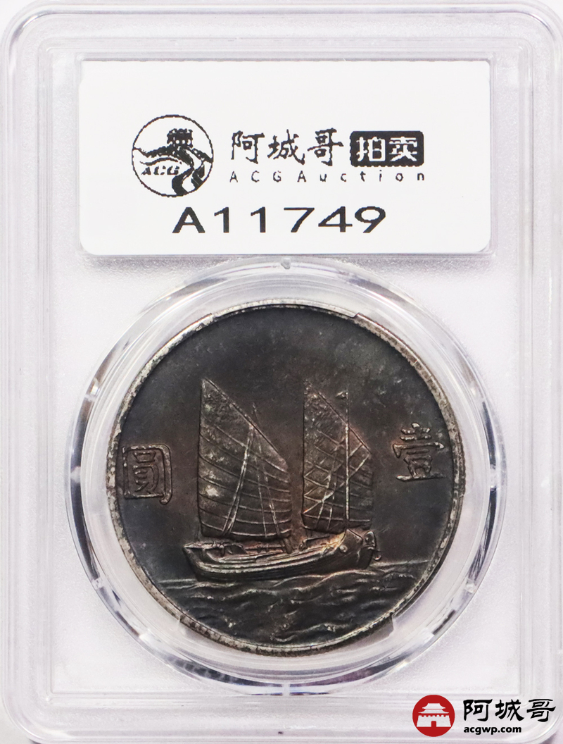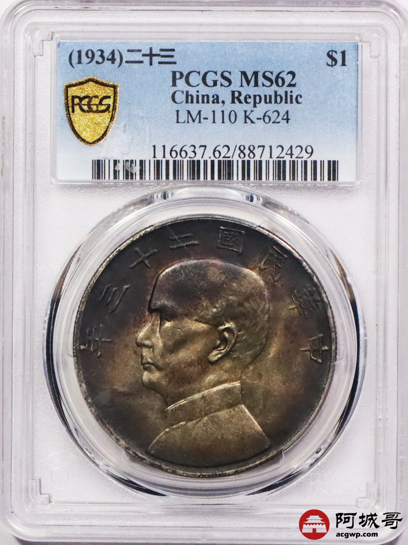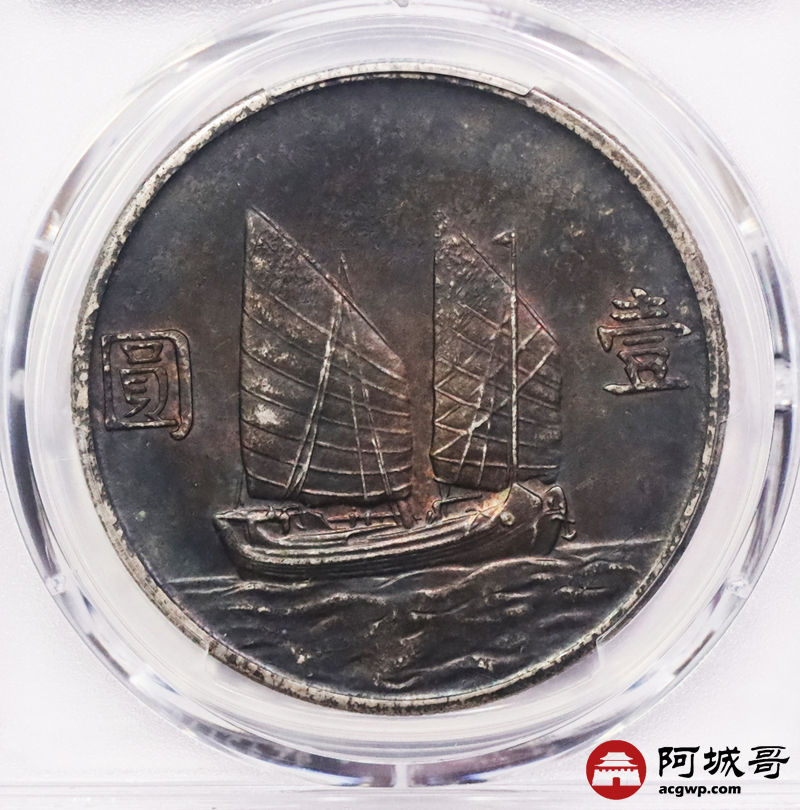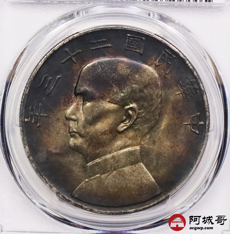 Lot:3213 1934民国二十三年孙中山像背帆船壹圆银币一枚,入骨老五彩包浆 PCGS MS62