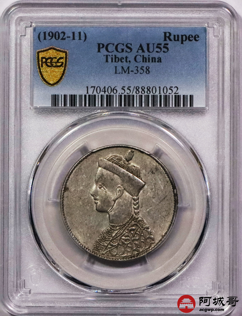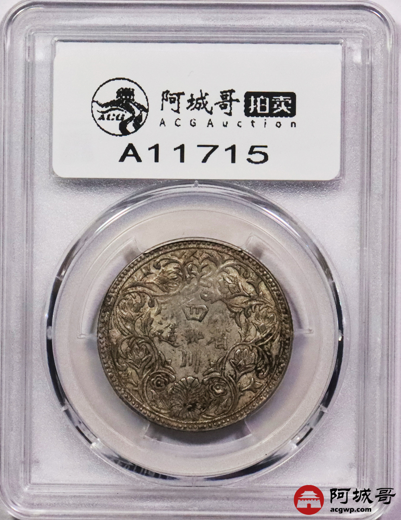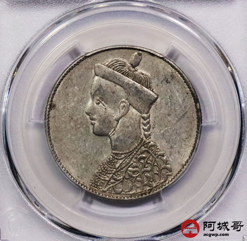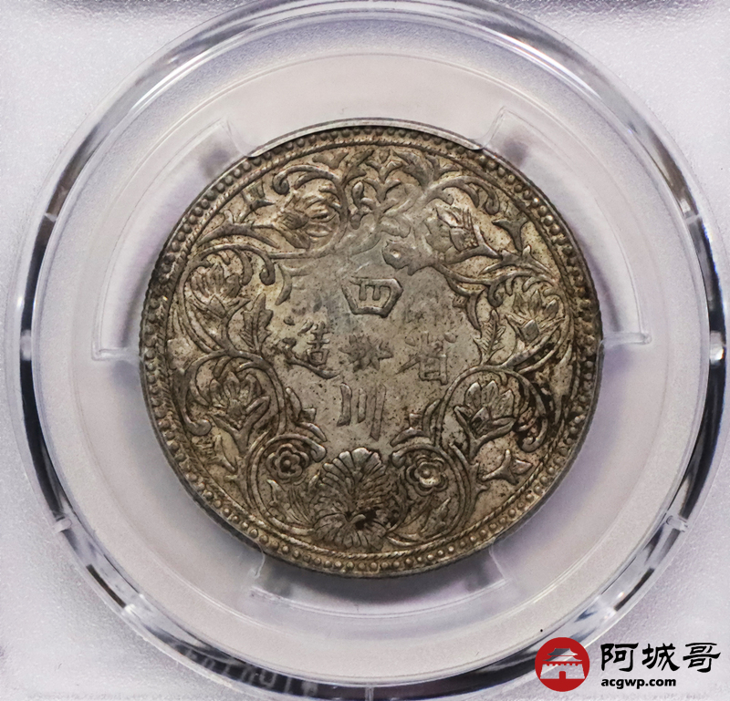 Lot:3255 1902-11四川省造光绪一期卢比银币一枚,无领横花版,黄油包浆,PCGS AU55