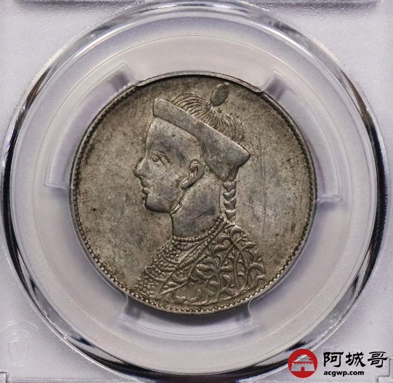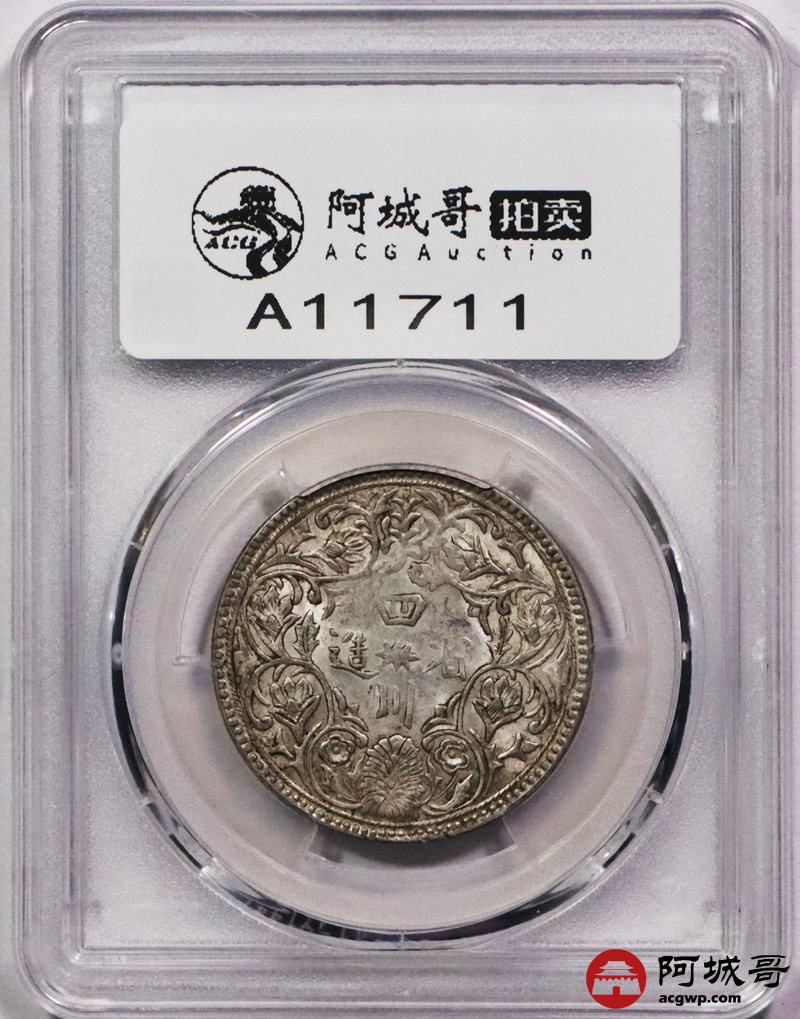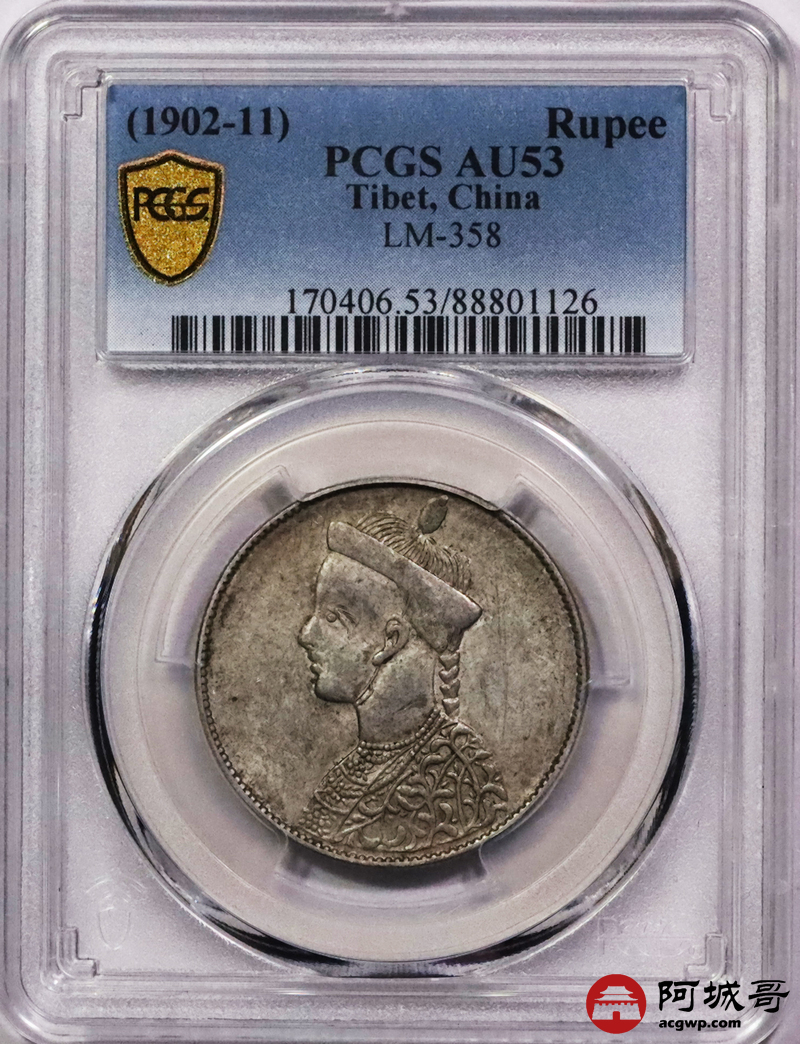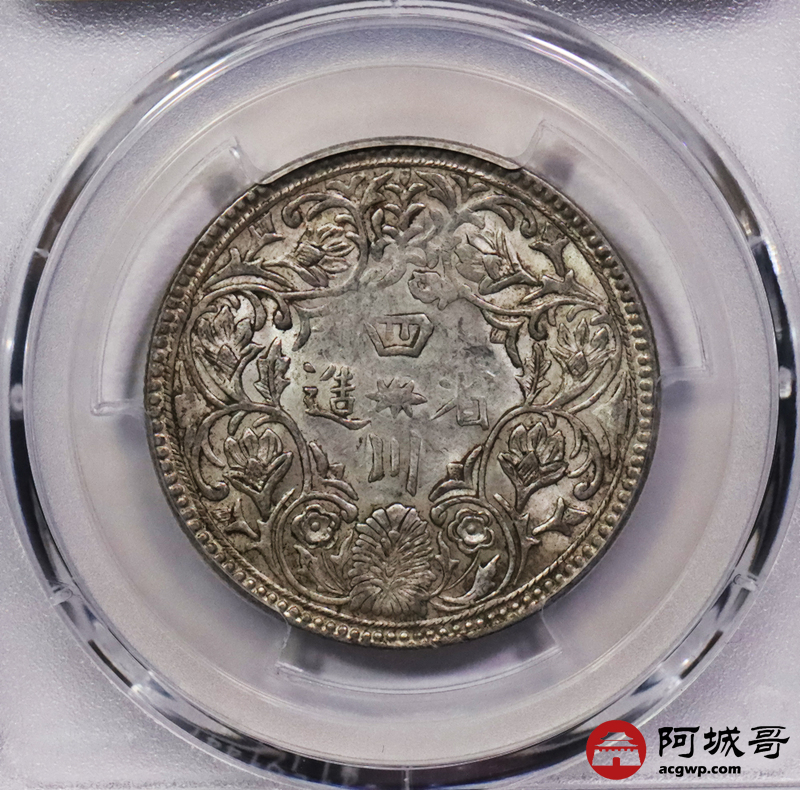 Lot:3258 1902-11四川省造光绪一期卢比银币一枚,无领横花版,黄油包浆 PCGS AU53