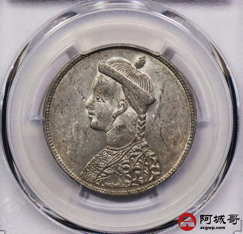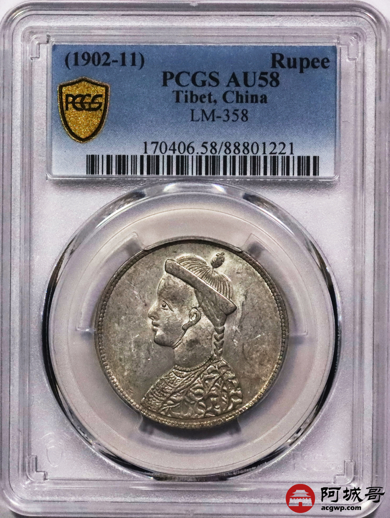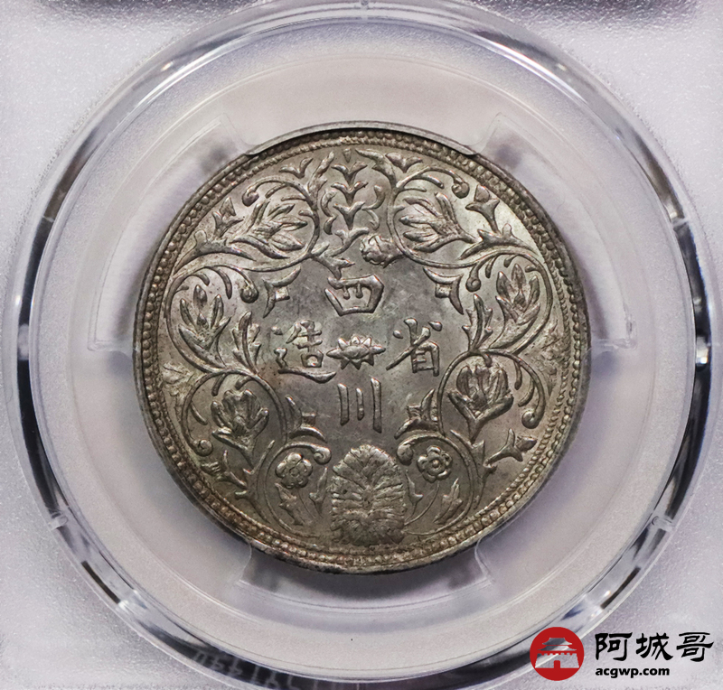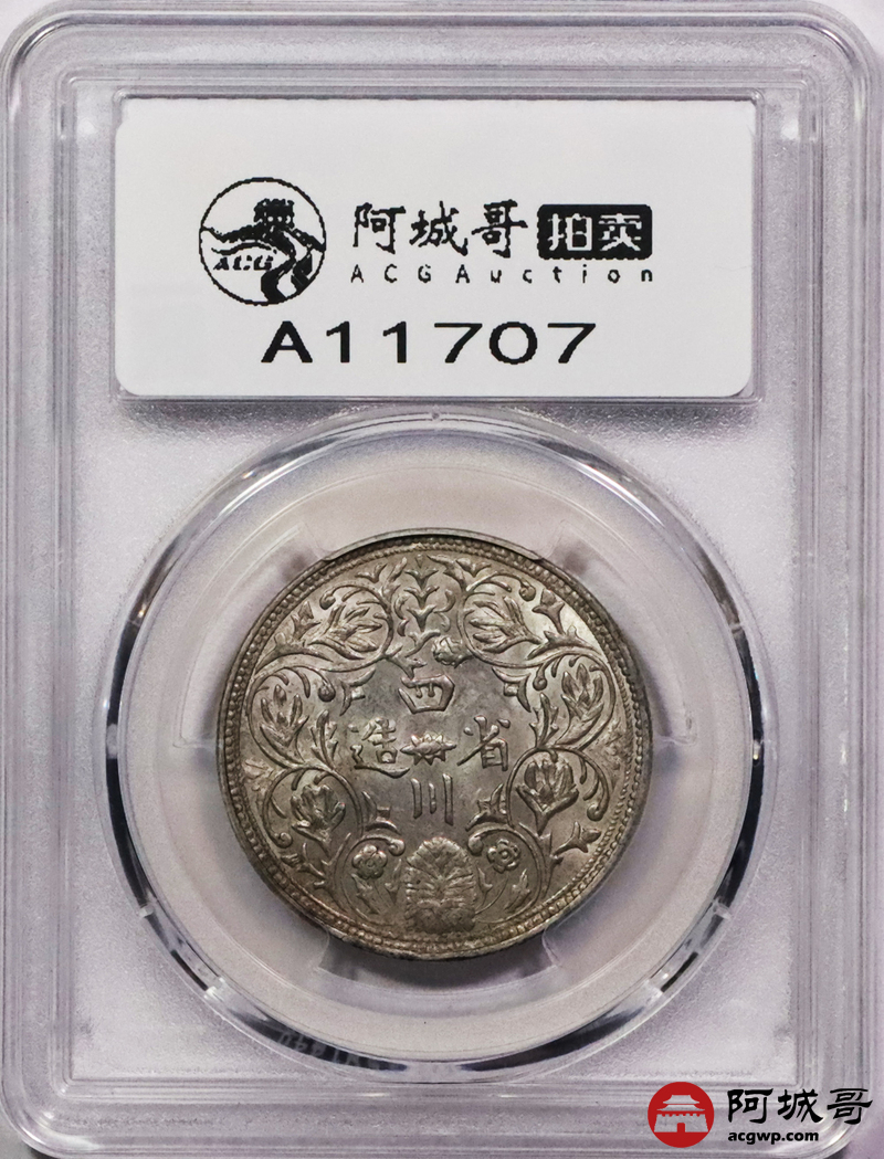 Lot:3251 1902-11四川省造光绪一期卢比银币一枚,无领横花版,黄油包浆 PCGS AU58