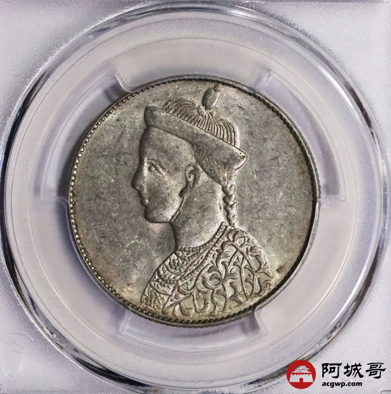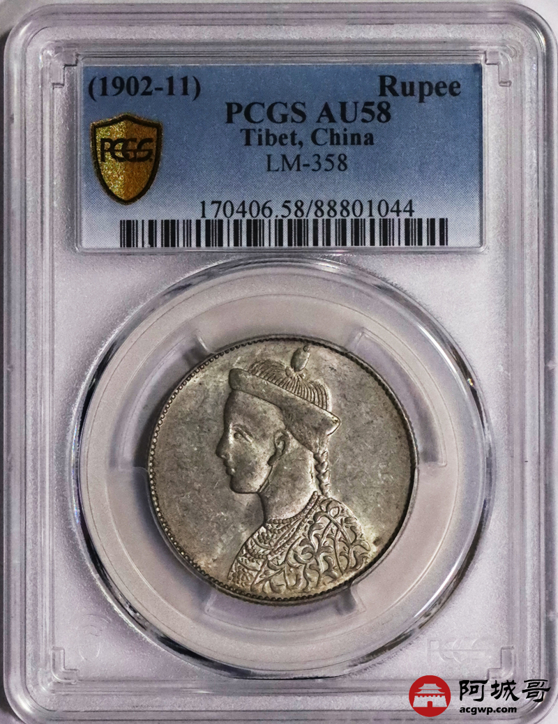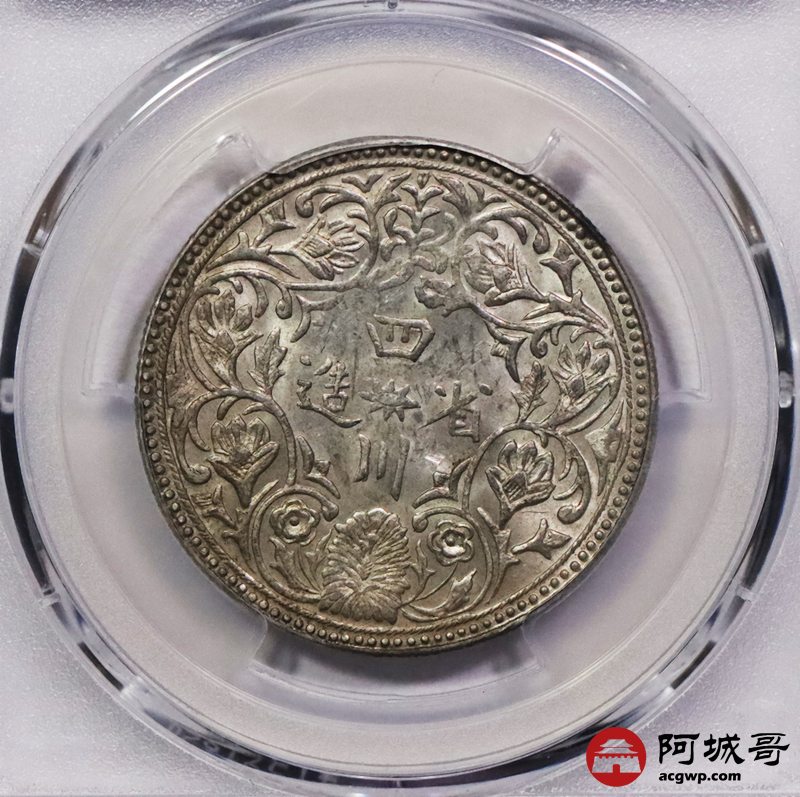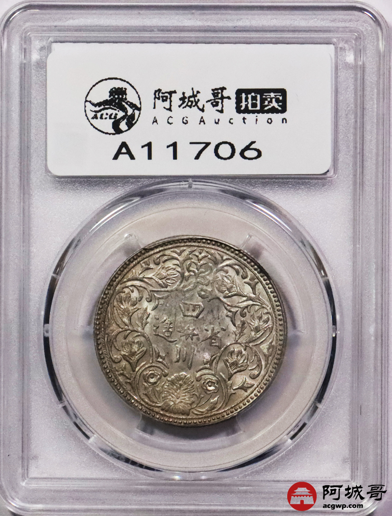 Lot:3261 1902-11四川省造光绪一期卢比银币一枚,无领横花版,黄油包浆 PCGS AU58