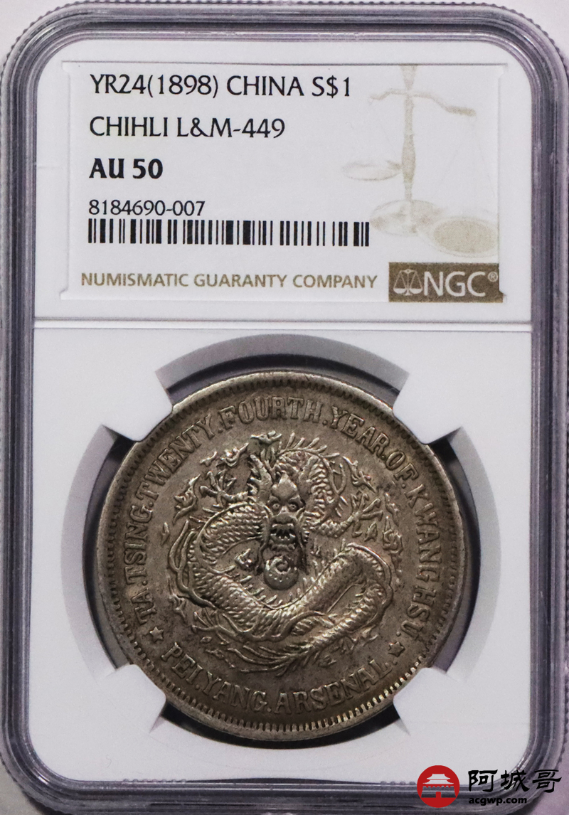 Lot:3246 1898光绪二十四年北洋机器局造大清壹圆银币一枚,原汁原味,NGC AU50