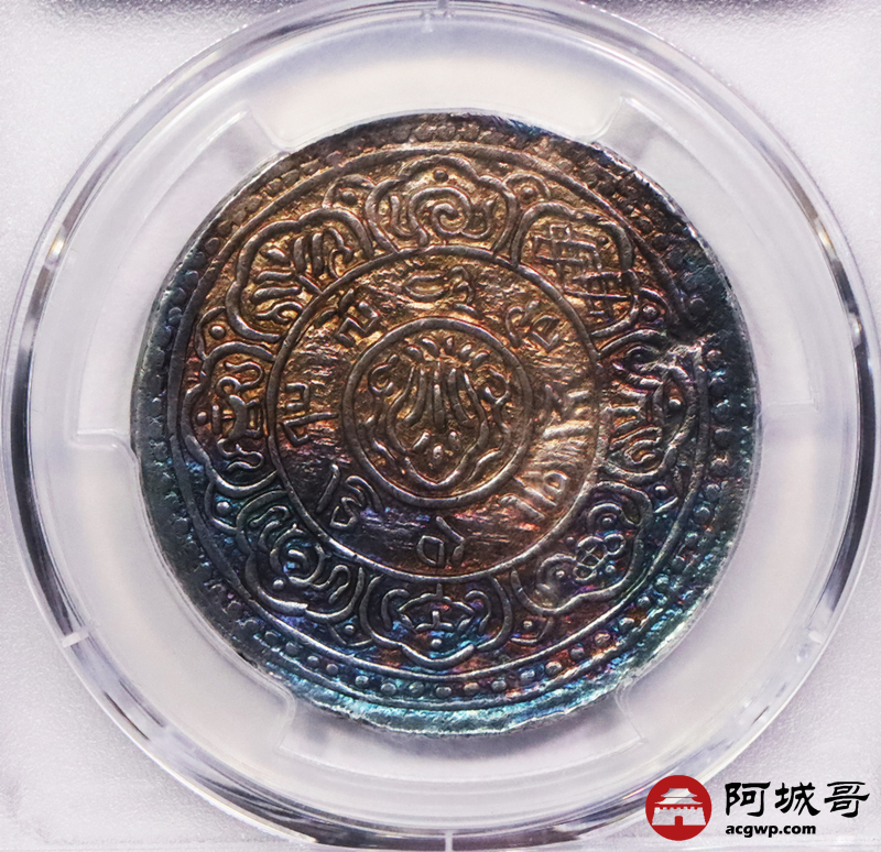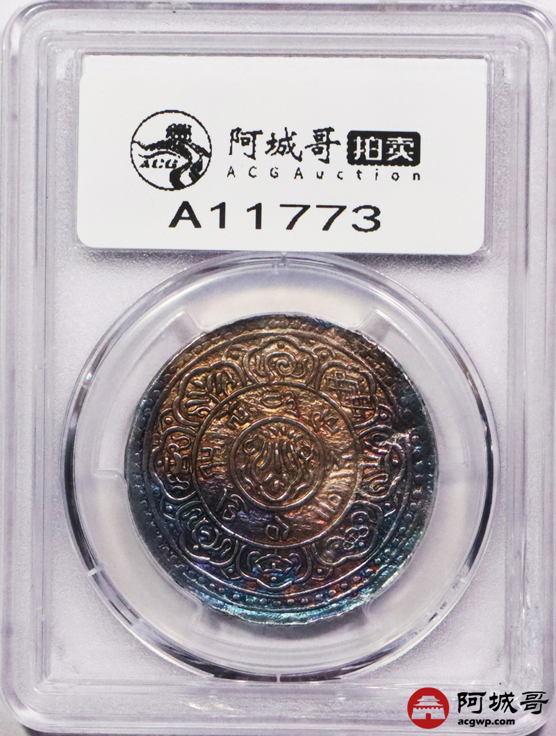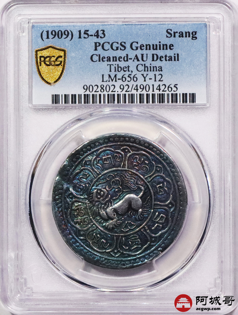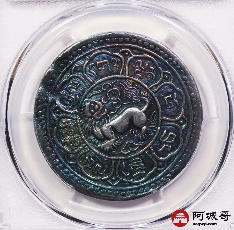 Lot:3458 1909/15-43西藏宣统大狮子桑康果木一两银币一枚,炫丽五彩包浆 PCGS AU