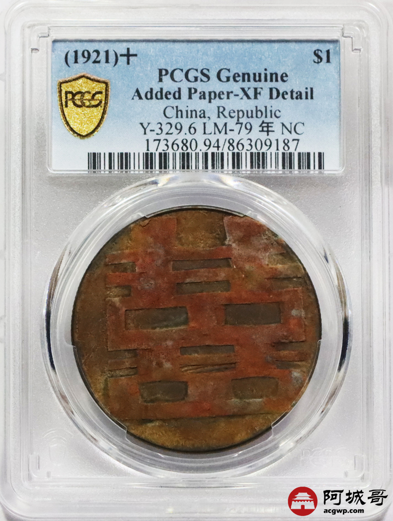 Lot:3535 1921民国十年袁世凯像壹圆银币一枚,老包浆,双囍贴纸 PCGS XF