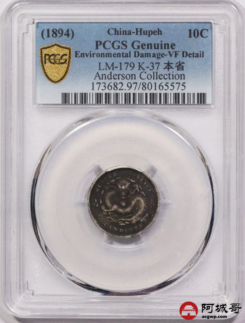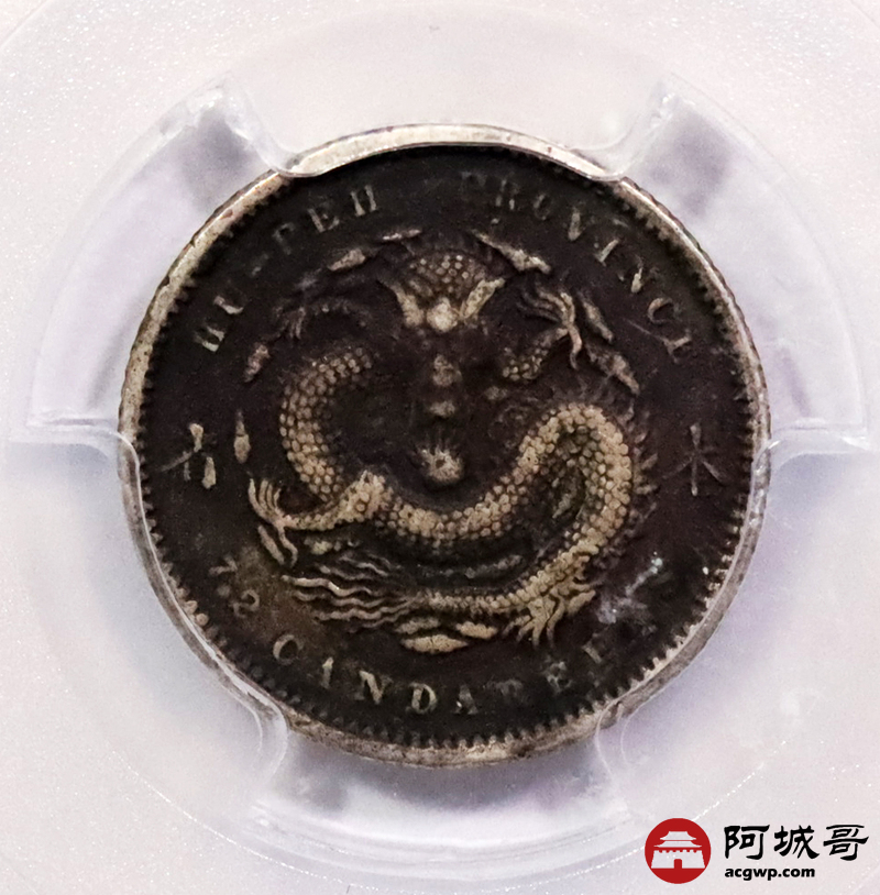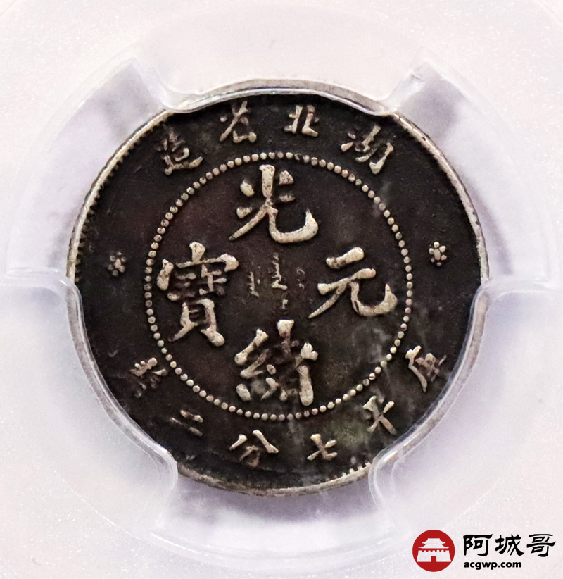 Lot:3081 1894湖北省造"本省"光绪元宝库平七分二厘银币一枚,酱彩包浆,稀少品种 PCGS VF