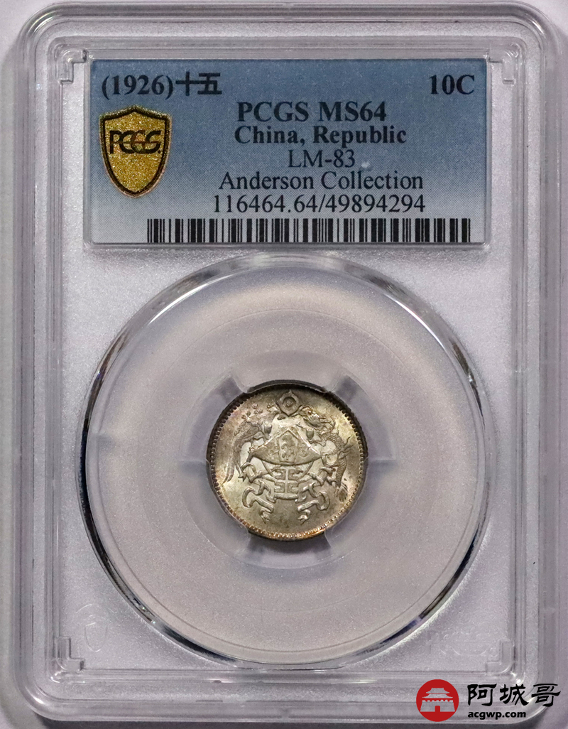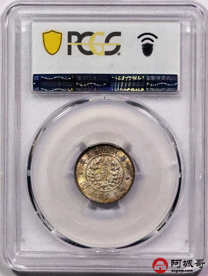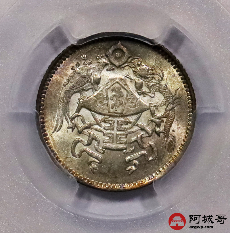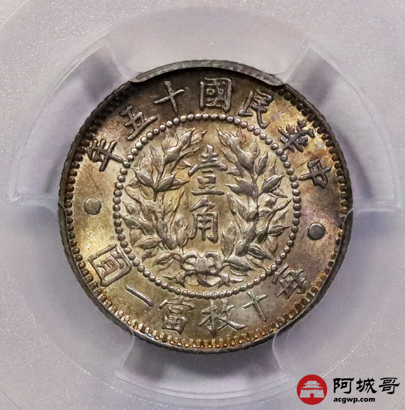 Lot:3169 1926民国十五年龙凤壹角银币一枚,车轮转光,细节精美,底板氧化五彩 PCGS MS64