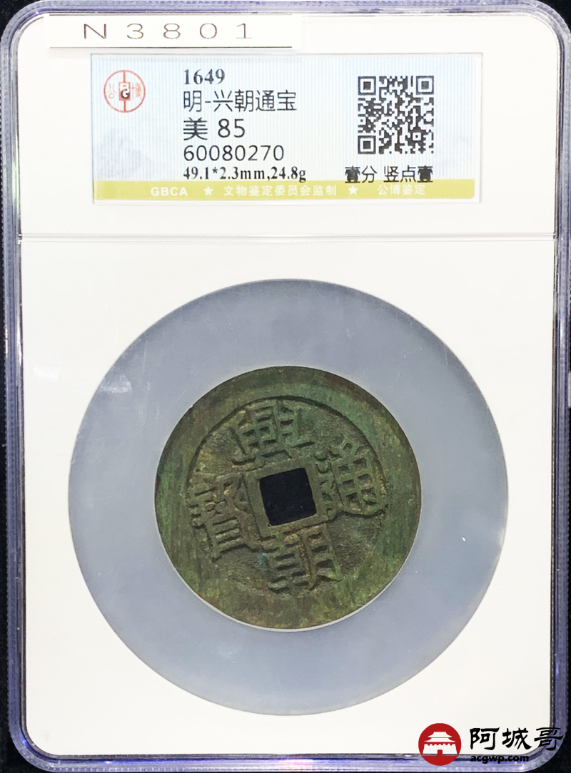 Lot:3801 明-兴朝通宝,壹分,竖点壹铜钱一枚,GBCA 美85