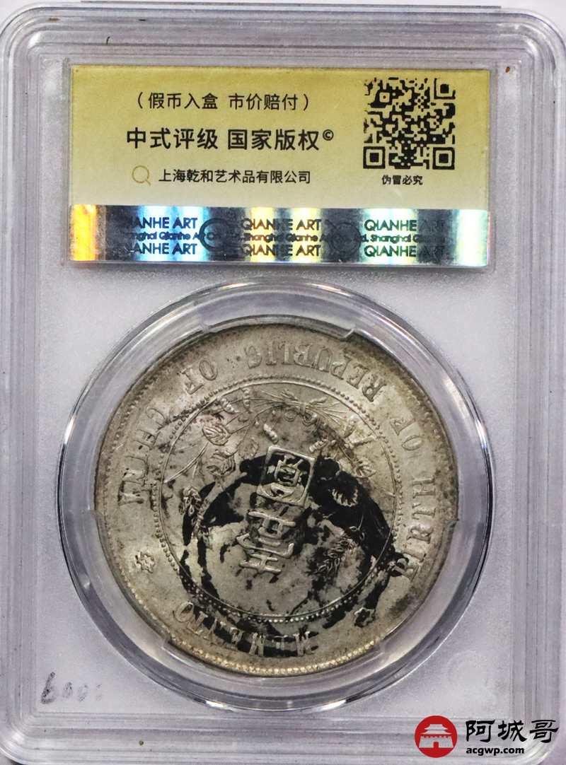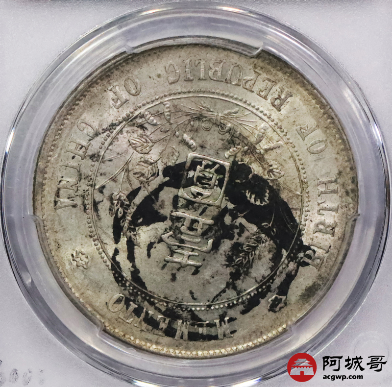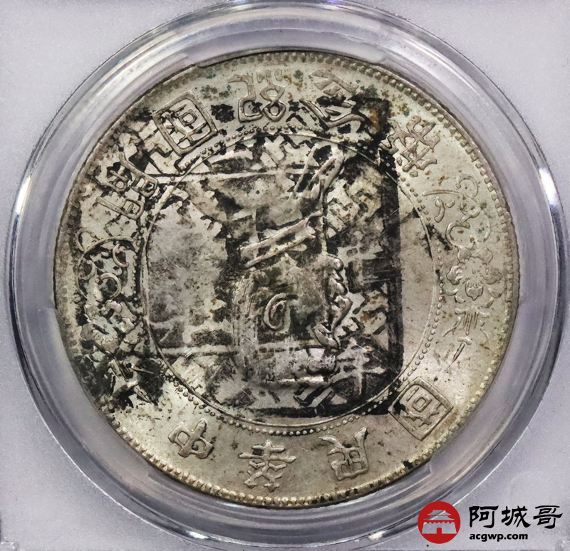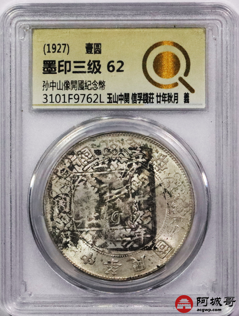 Lot:3773 1927孙中山像开国纪念壹圆银币一枚,玉山中关,信孚钱庄,廿年秋月,義,墨印三级,中式评级62