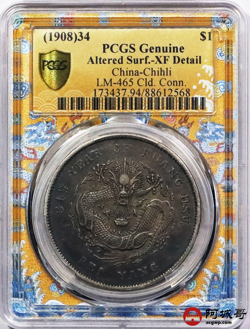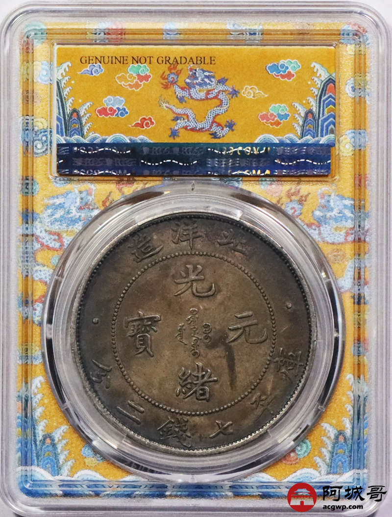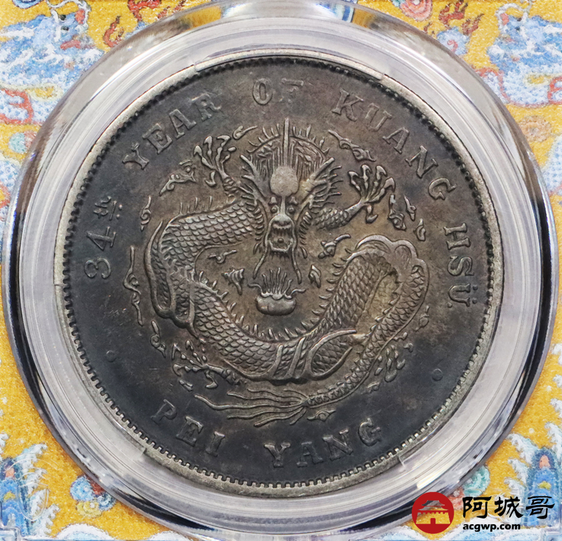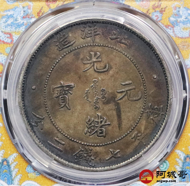 Lot:3318 1908三十四年北洋造光绪元宝库平七钱二分银币一枚,酱彩包浆 PCGS XF
