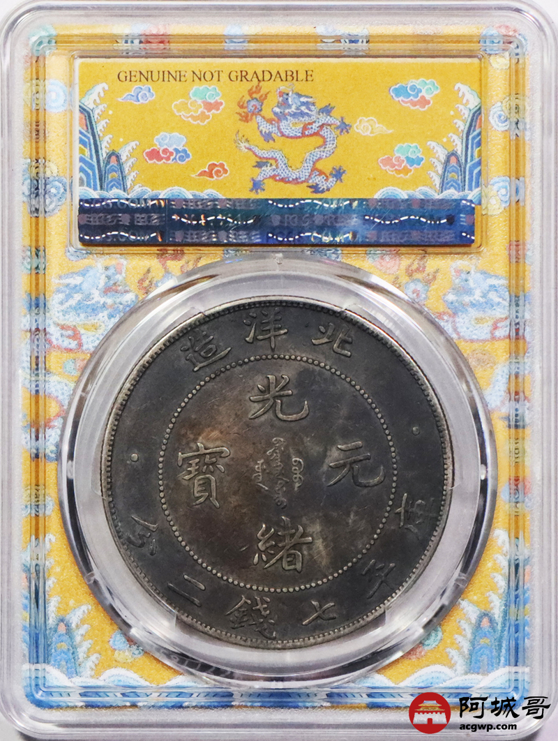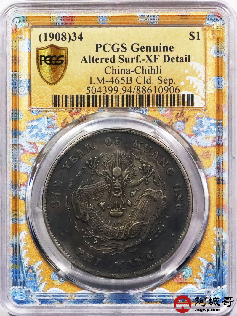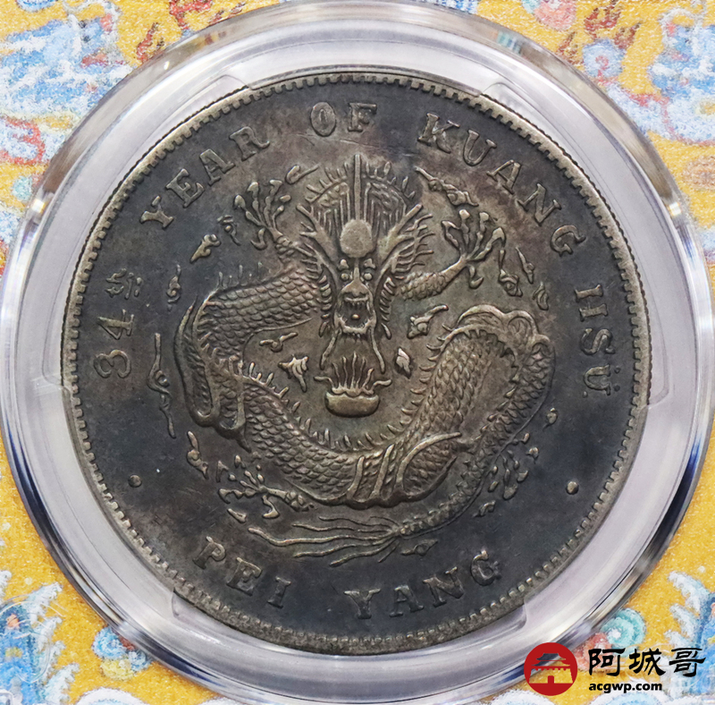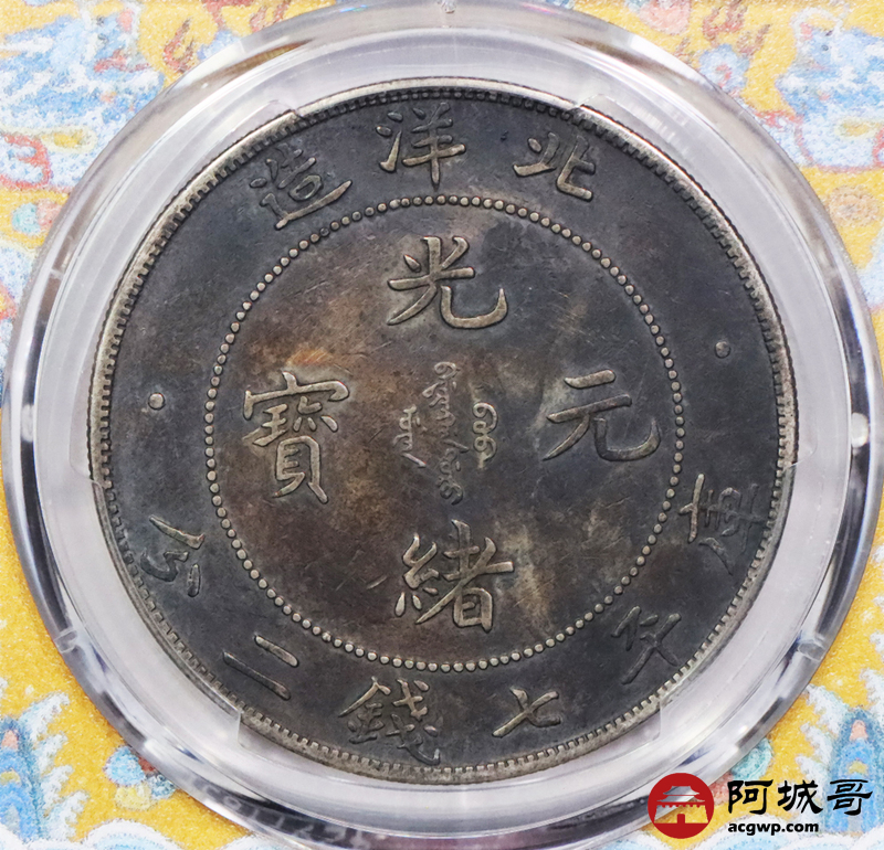 Lot:3320 1908三十四年北洋造光绪元宝库平七钱二分银币一枚,开云版,酱彩包浆 PCGS XF