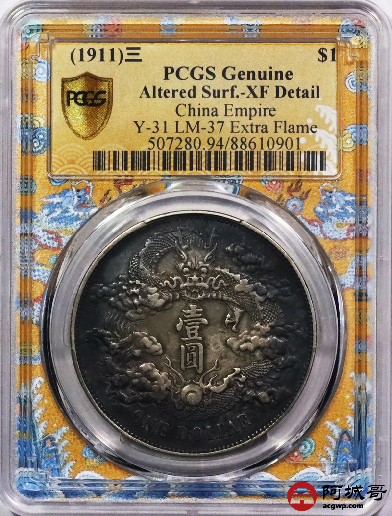 Lot:3051 1911宣统三年大清壹圆银币一枚,酱彩包浆 PCGS XF